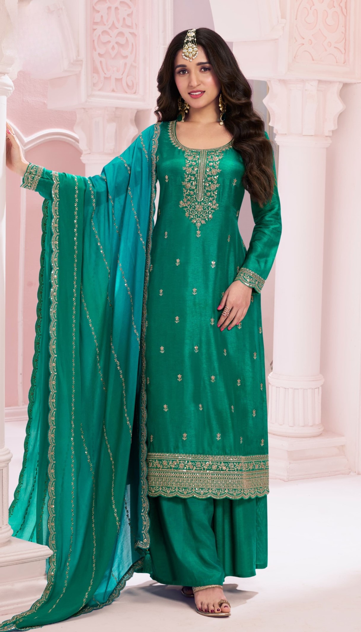 Green Premium Embroidered Vichitra Silk Semi Stitched Salwar Suit