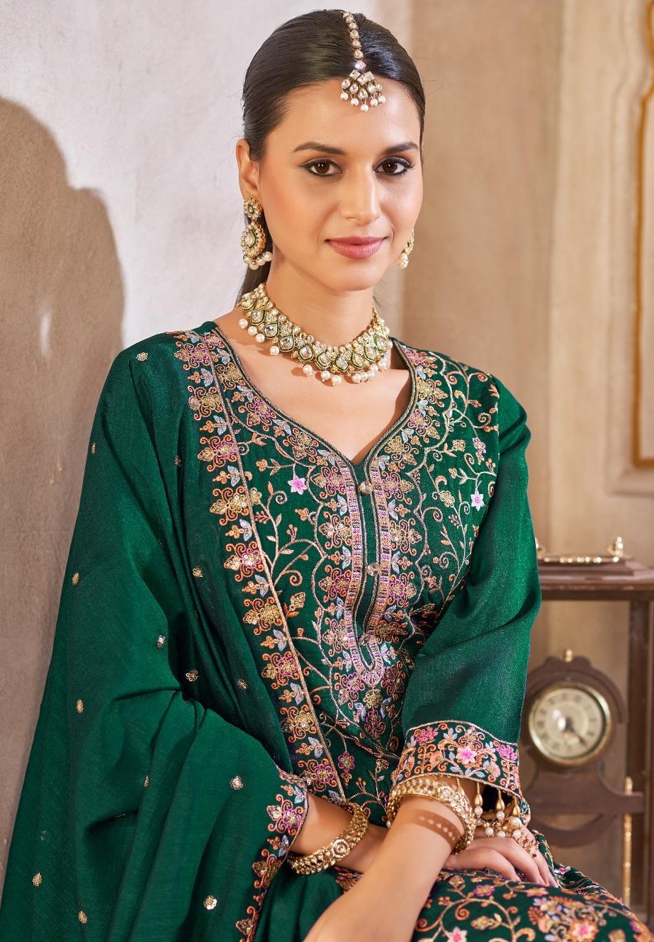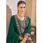 Green Vichitra Silk Readymade Suit with Embroidery & Lace Work