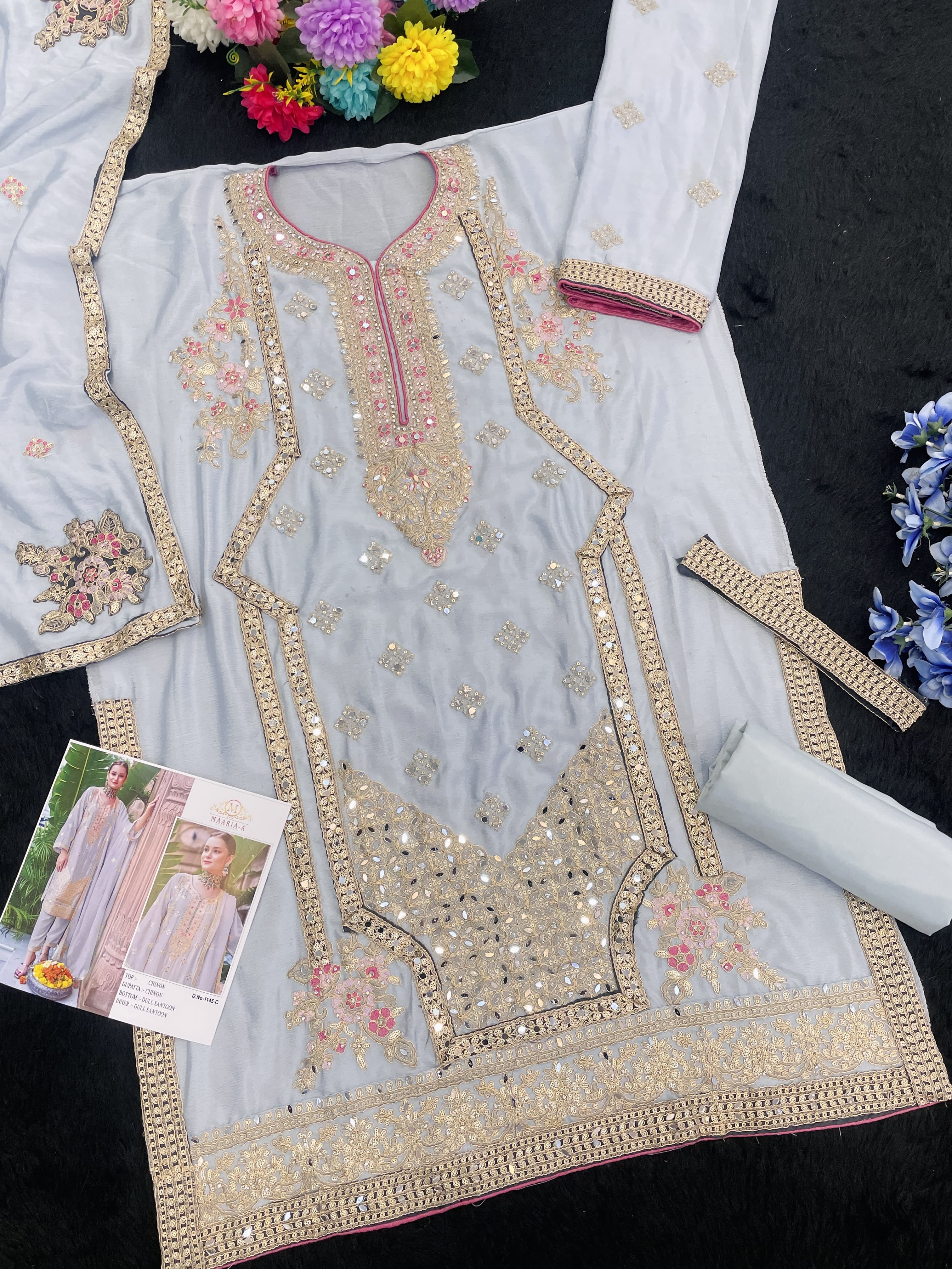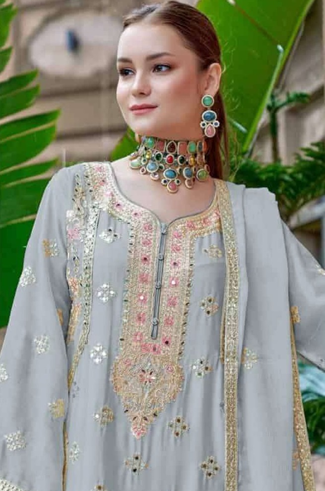 Grey Chinon With Embroidery Codding Sequence Semi-Stitched Salwar Suit