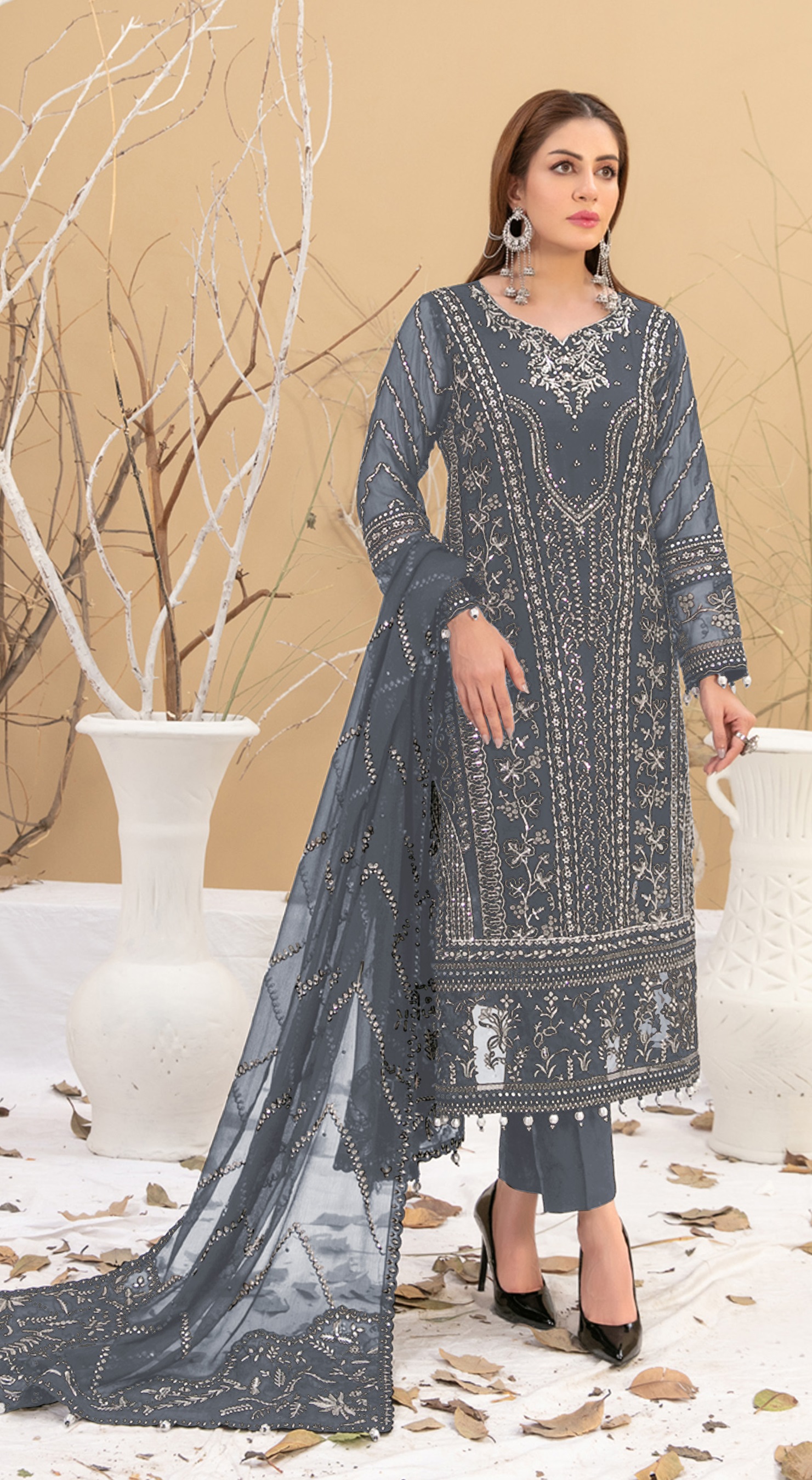Grey Embroidered Faux Georgette Semi Stitched Salwar Suit