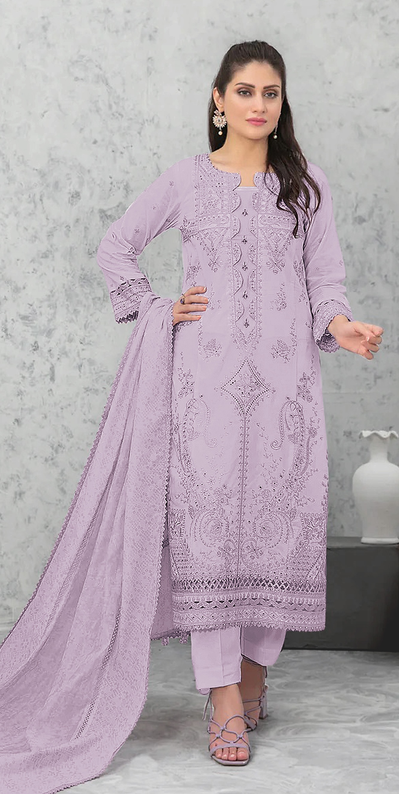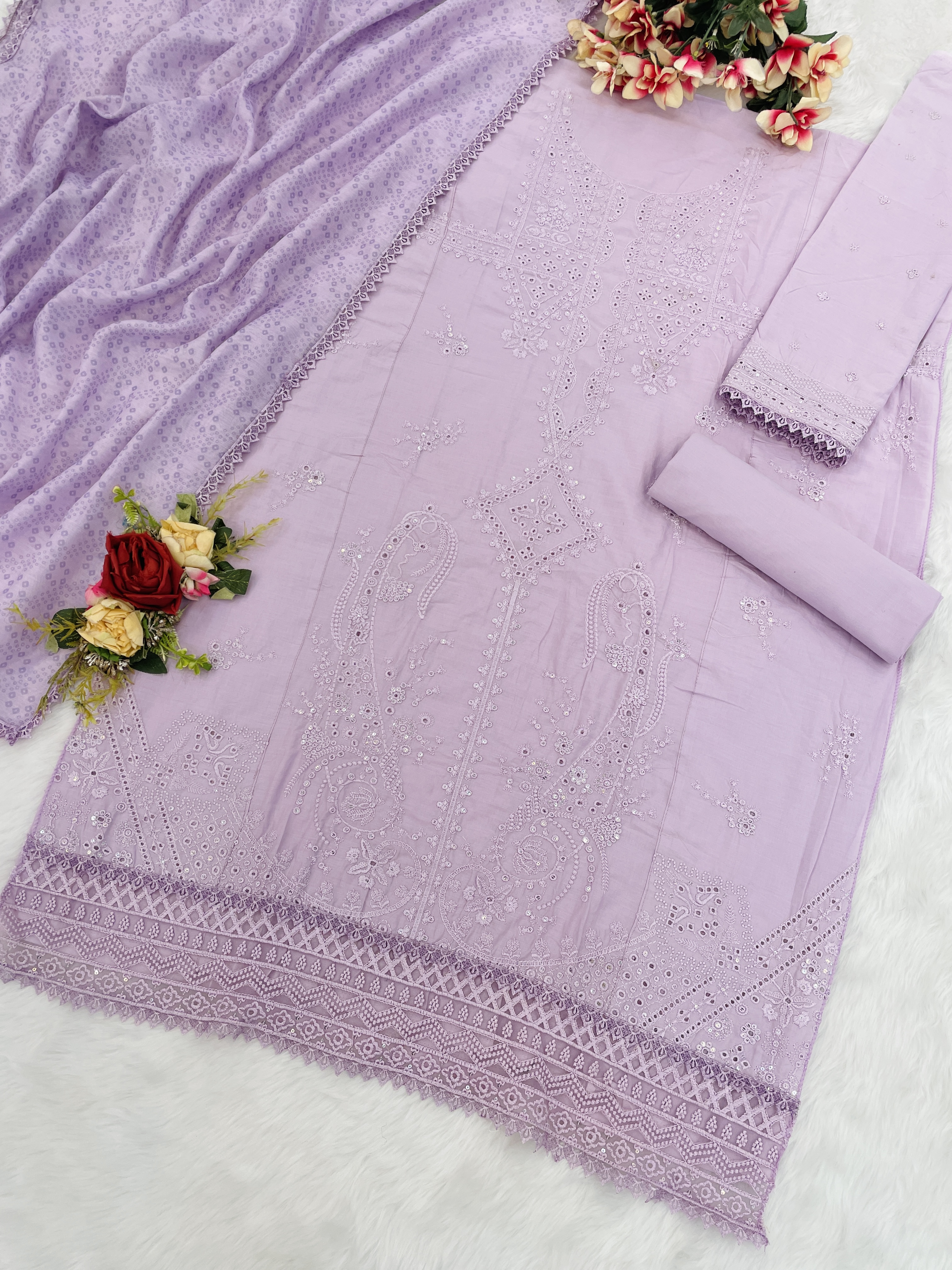 Lavender Embroderied Cotton Semi-Stitched Salwar Suit