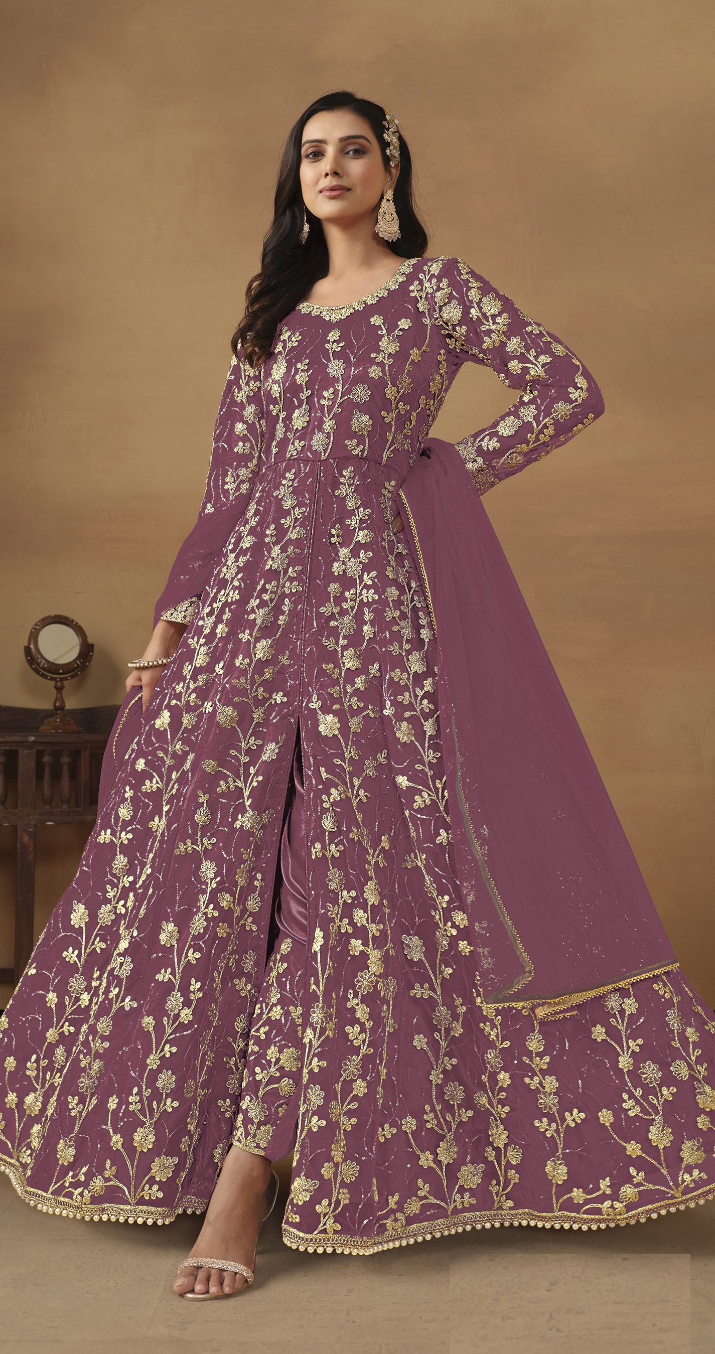Lavender Embroidered Butterfly Net Semi Stitched Anarkali Suit