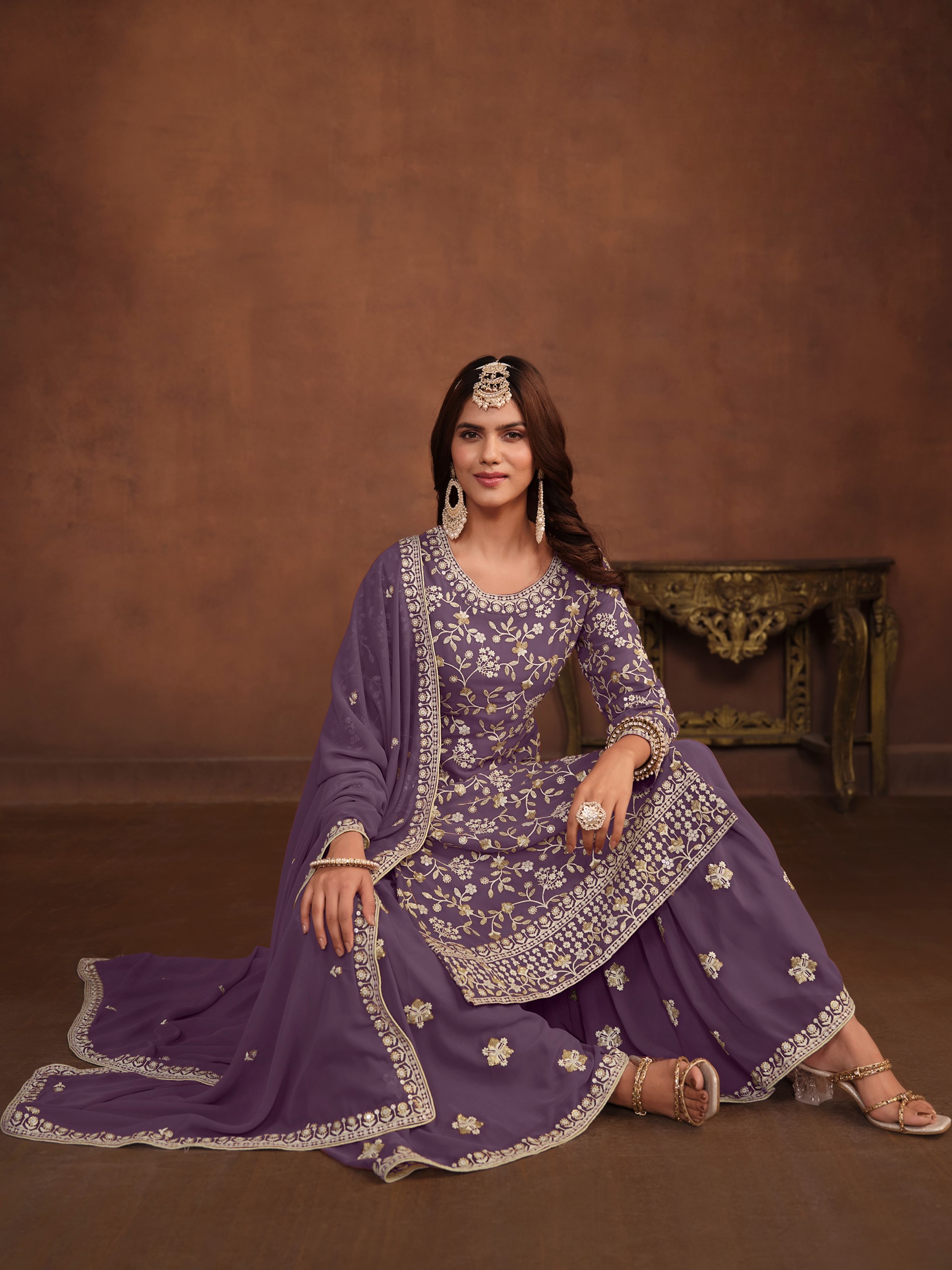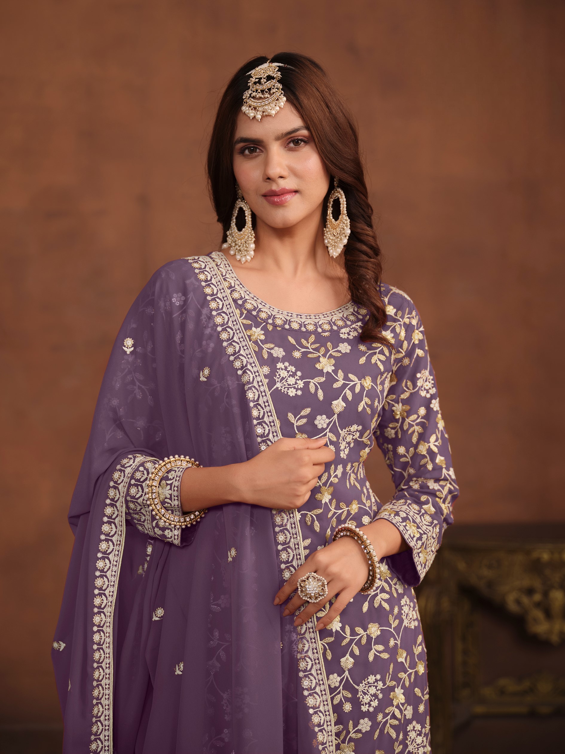 Lavender Embroidered Faux Georgette Semi Stitched Salwar Suit