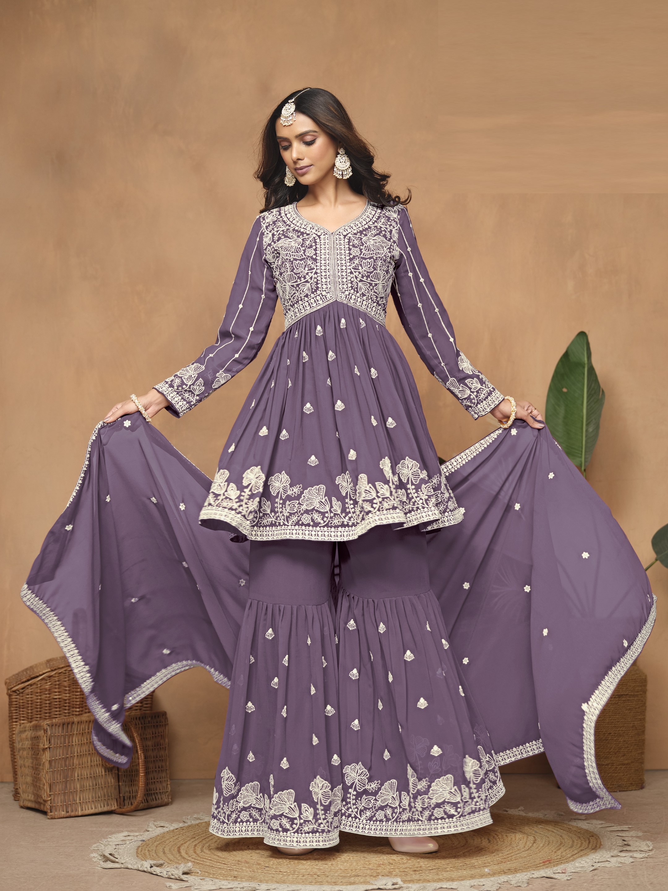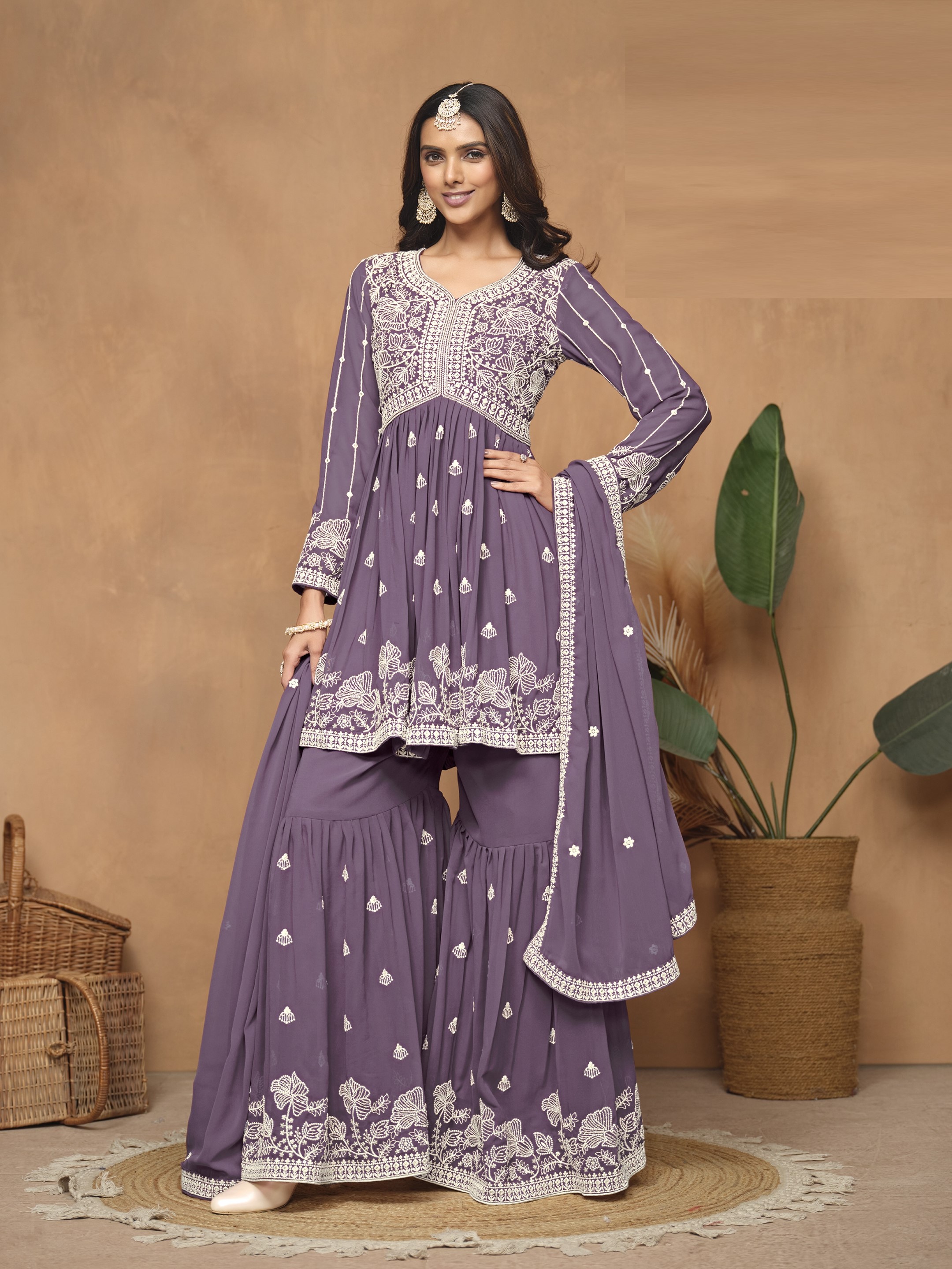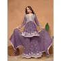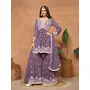 Lavender Embroidered Faux Georgette Semi Stitched Sharara Suit
