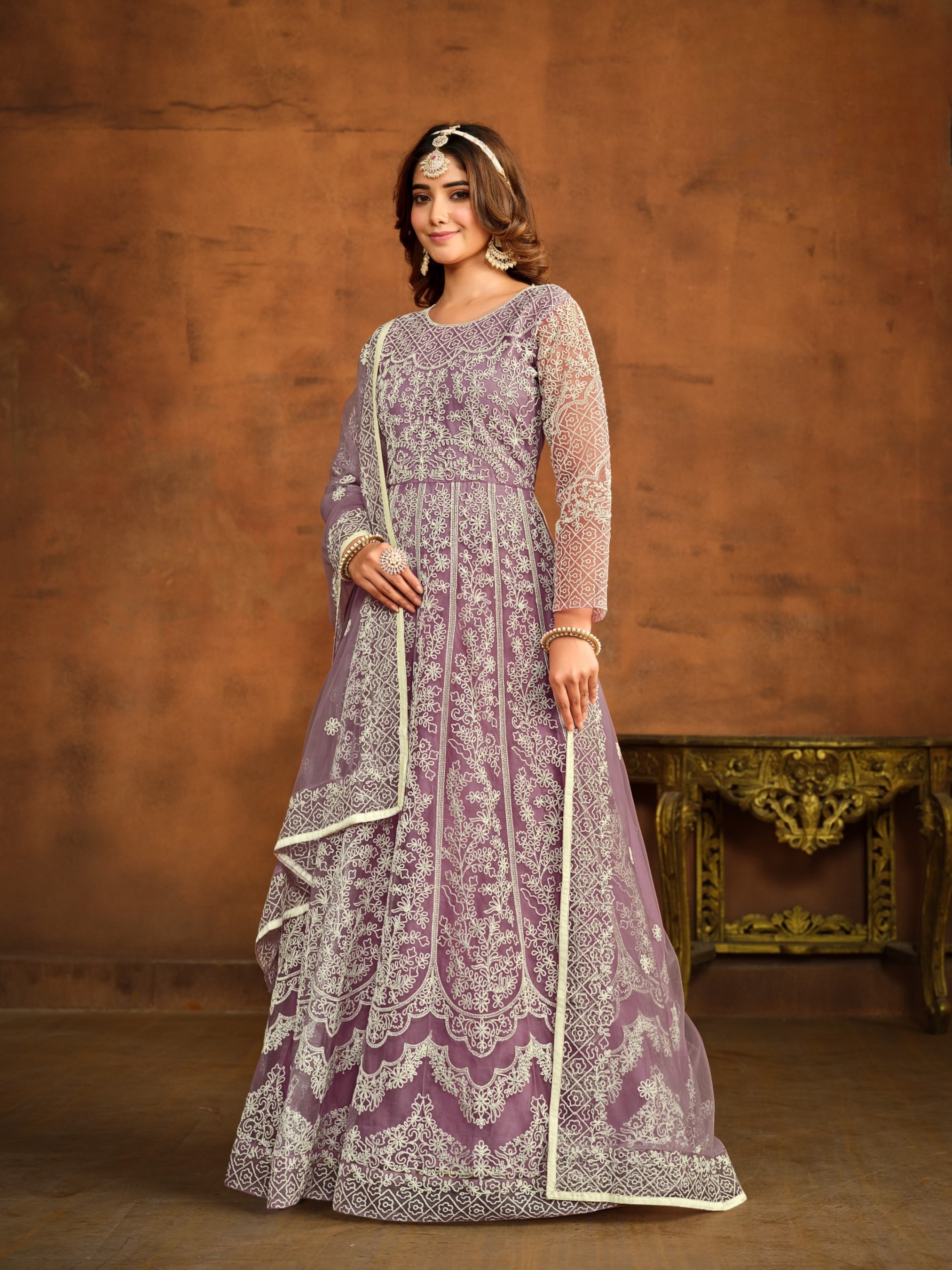 Lavender Embroidered Net Semi Stitched Anarkali Suit