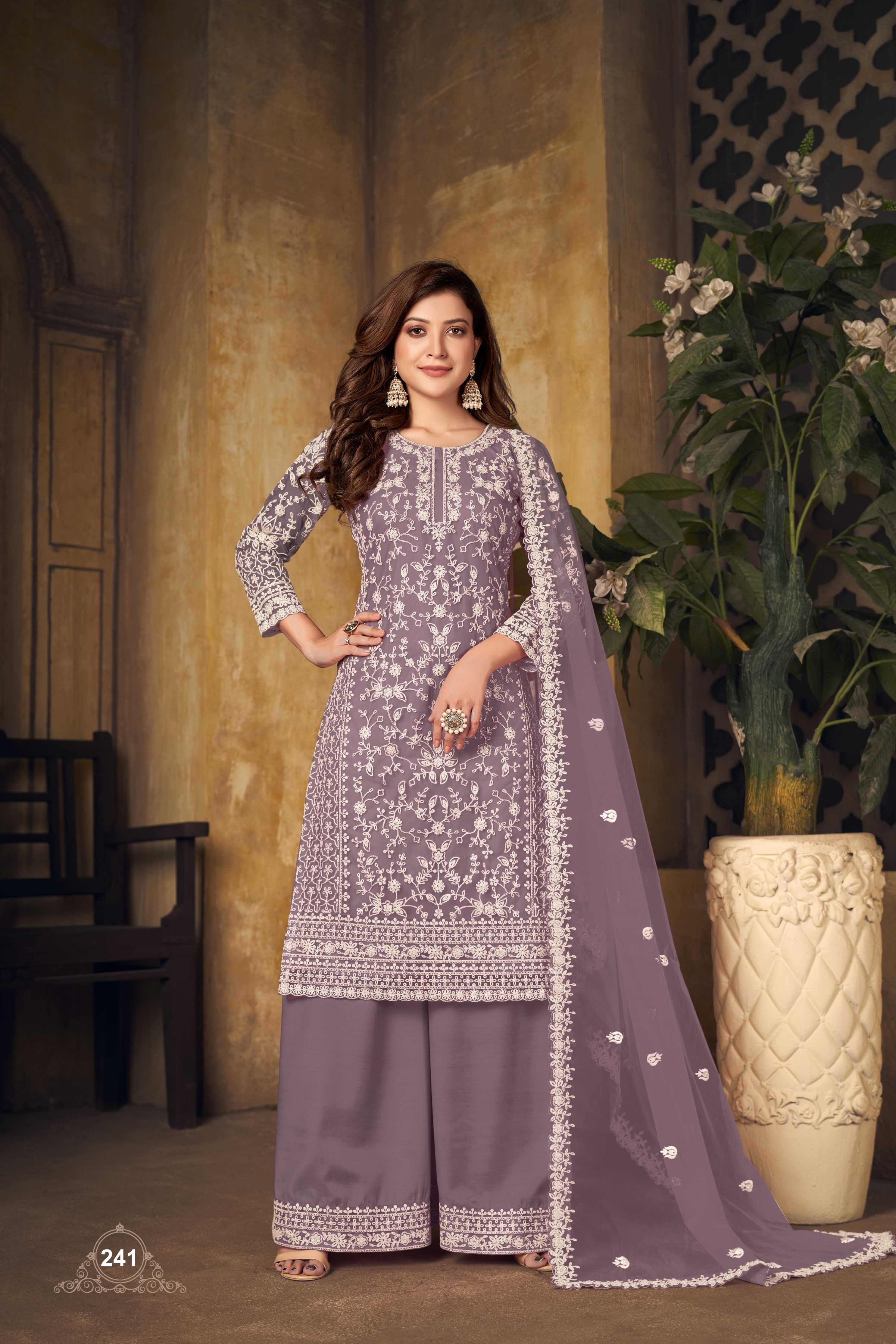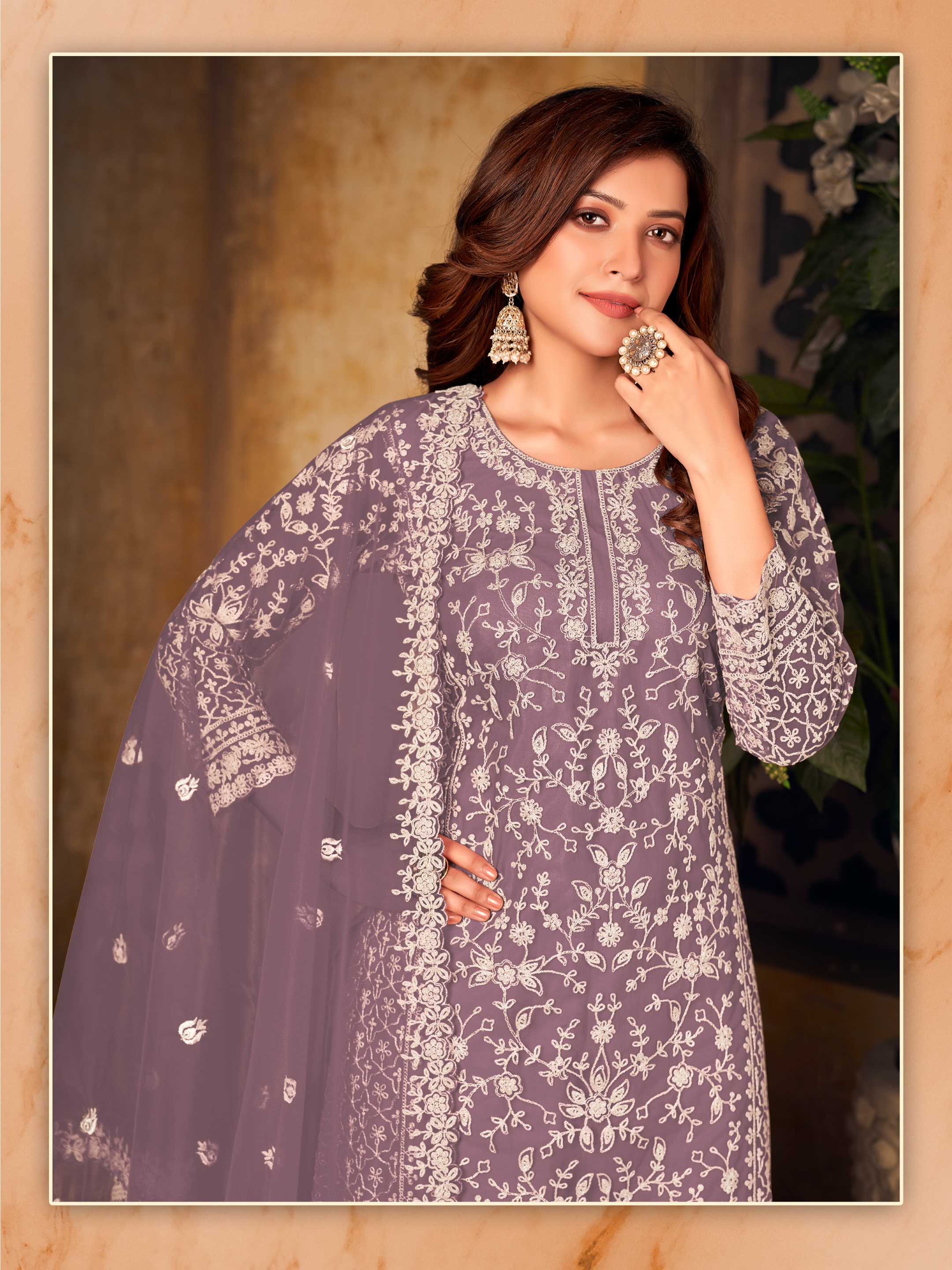 Lavender Embroidered Net Semi Stitched Plazzo Suit