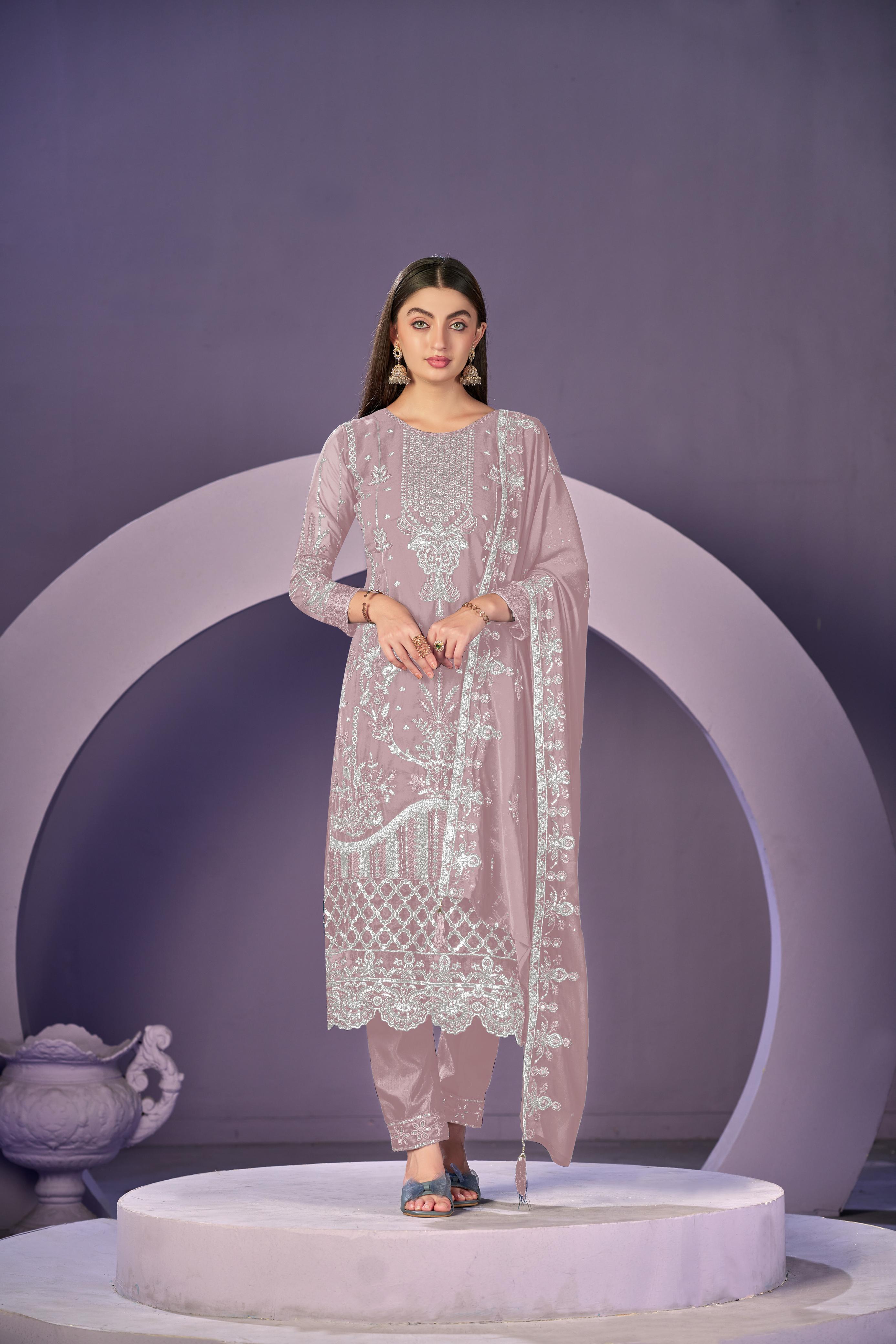 Lavender heavy georgette embroidered semi stitched suit with khatli work