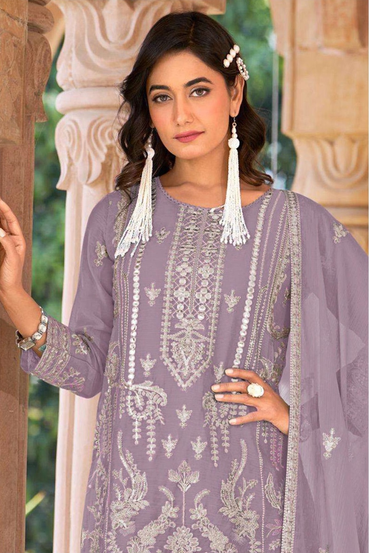Lavender Naylon Organza Semi Stitched Suit With Embroidery & Mirror Work