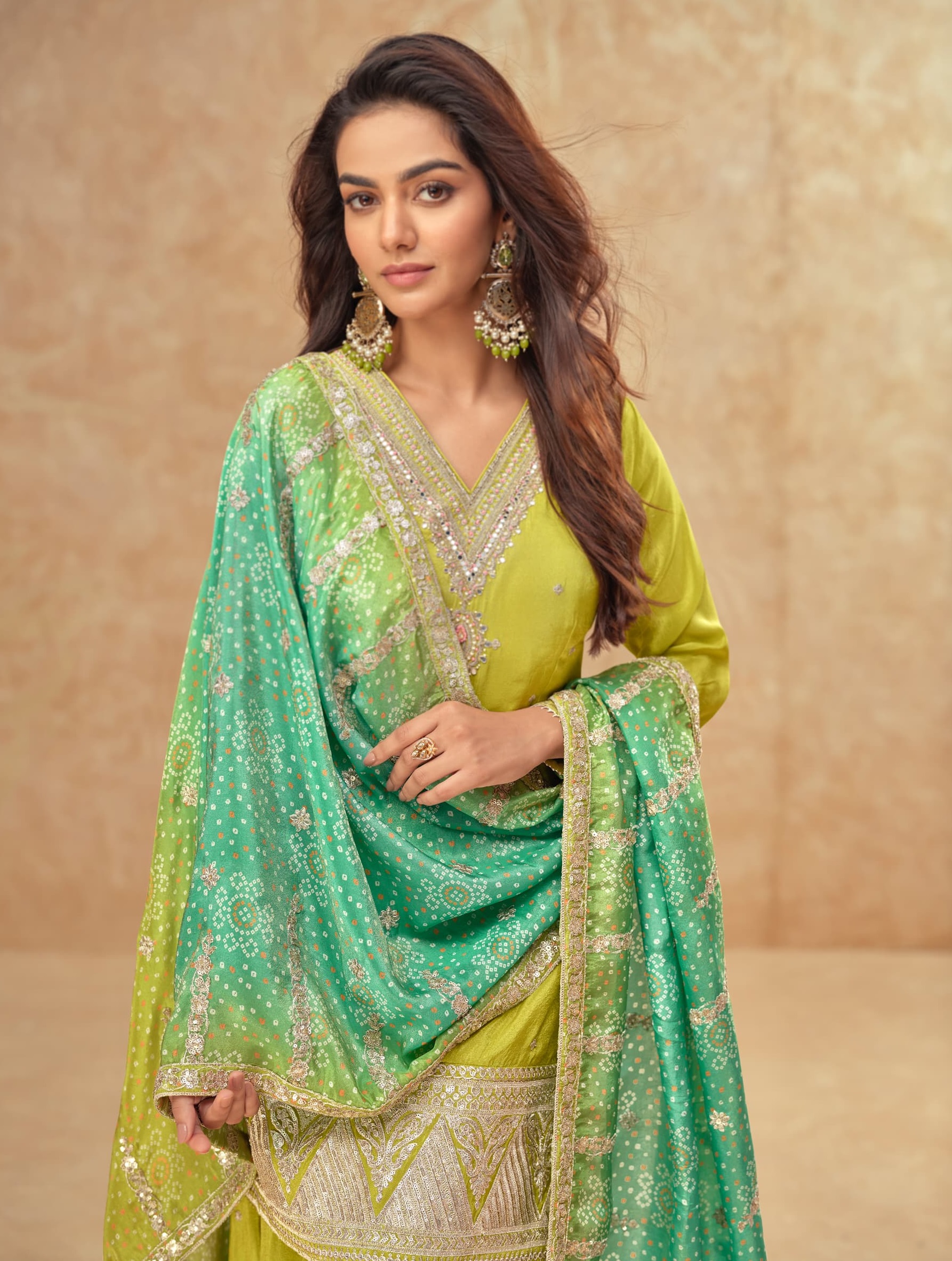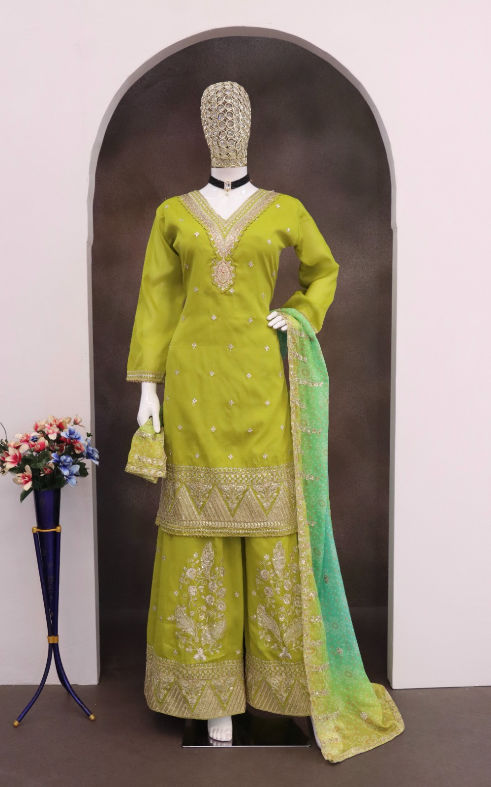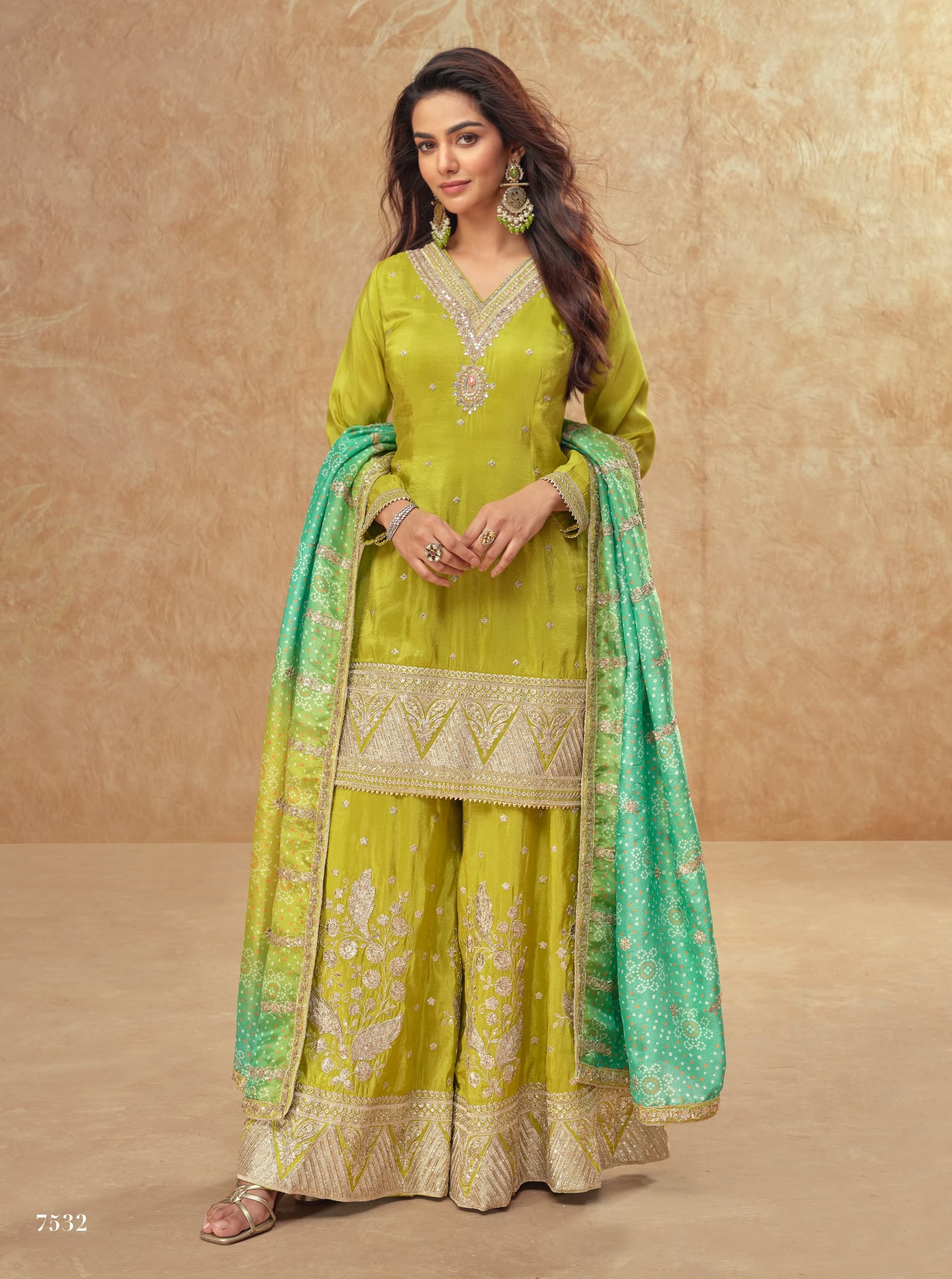 Lemon heavy embroidery work cosmos silk sharara suit(ready made)