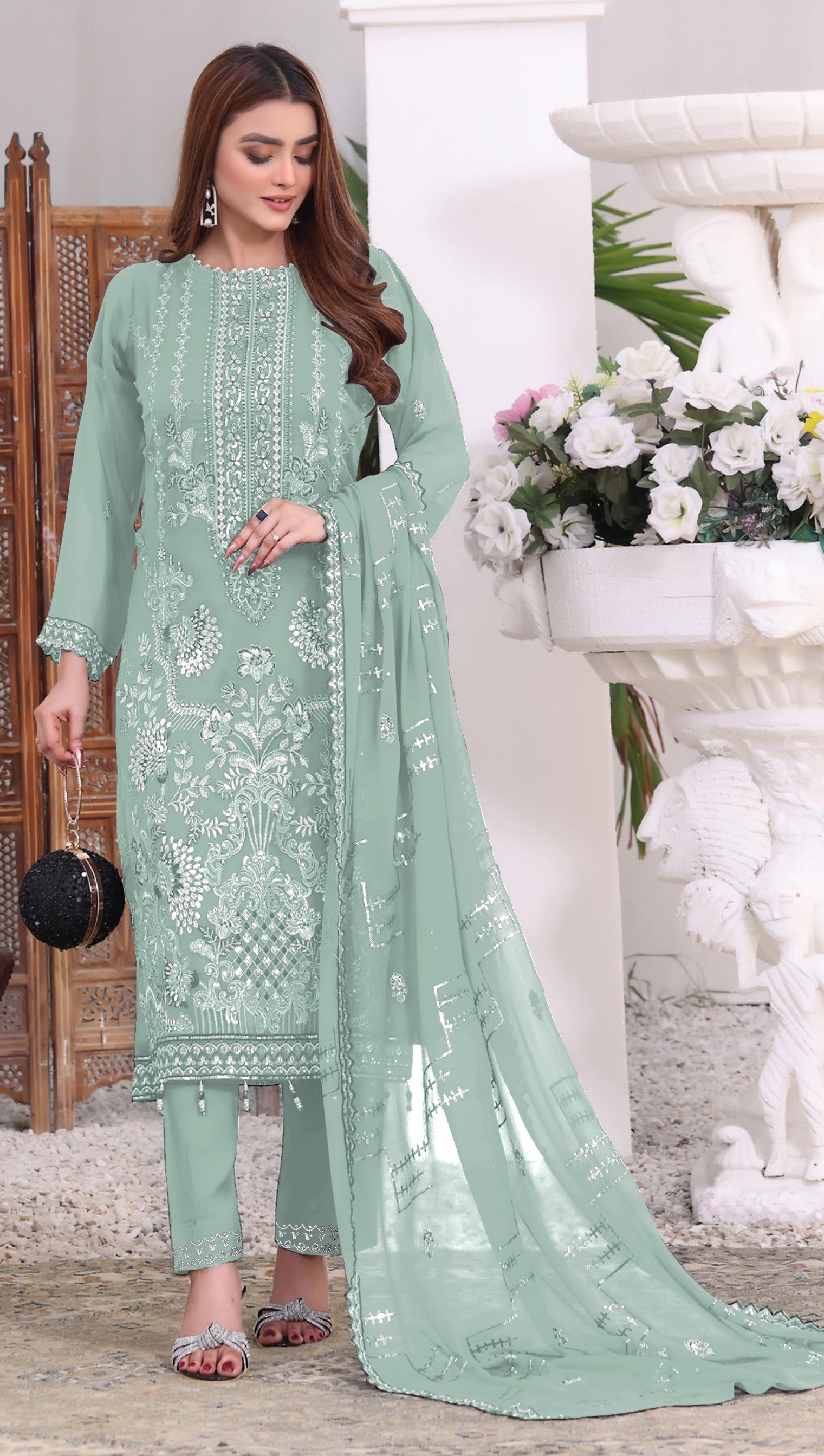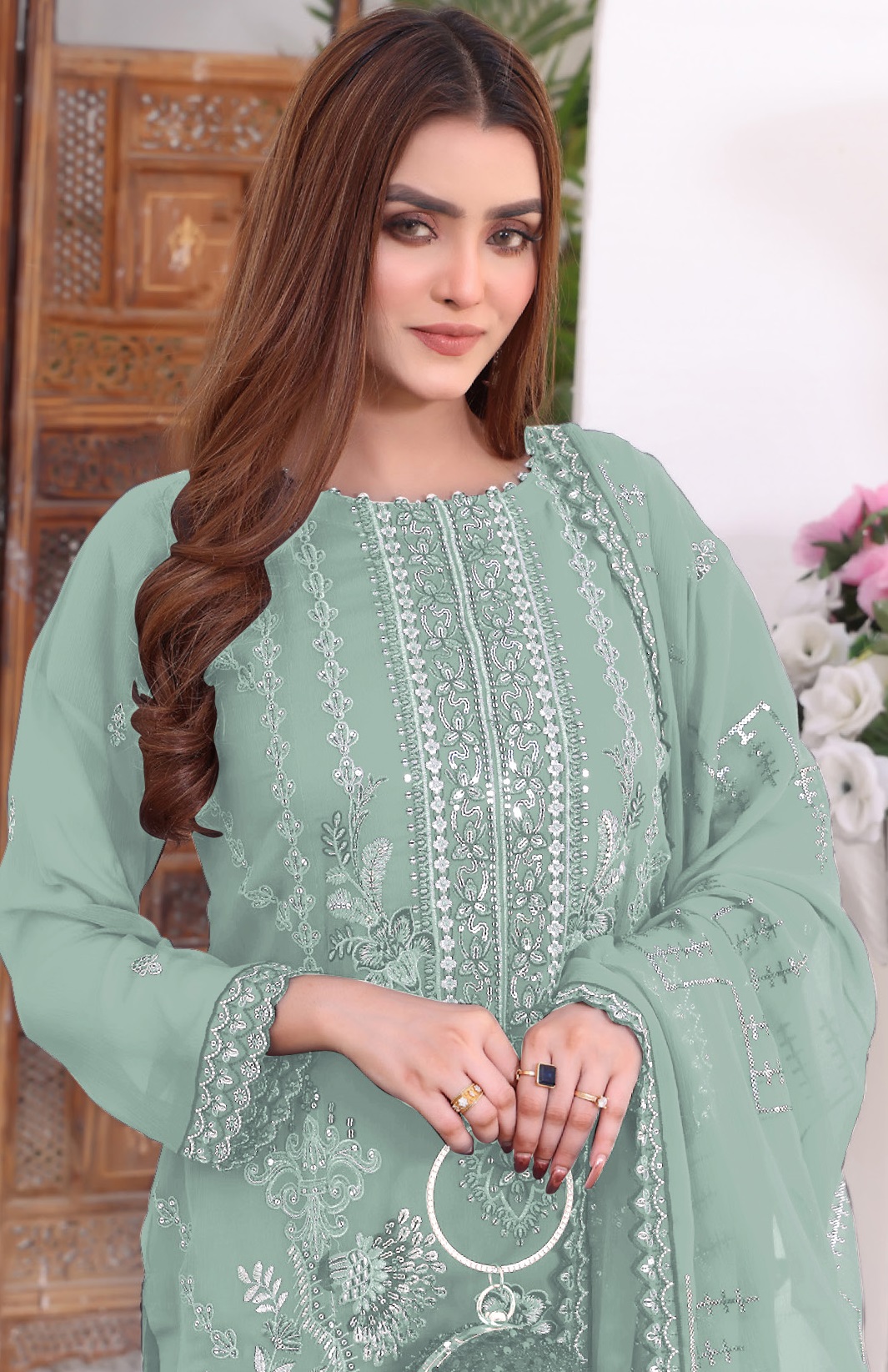 Light Green Embroidered Faux Georgette Semi Stitched Salwar Suit
