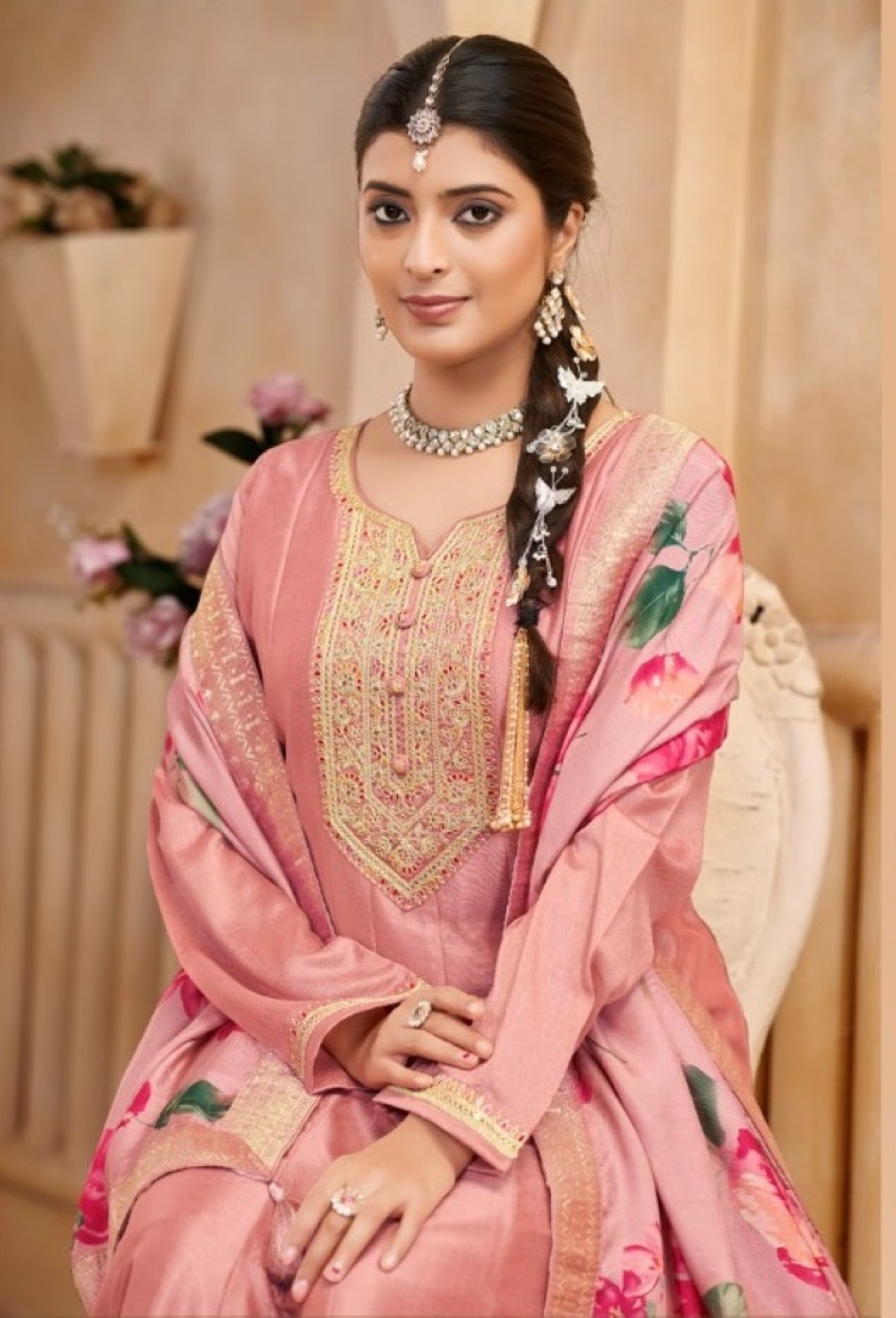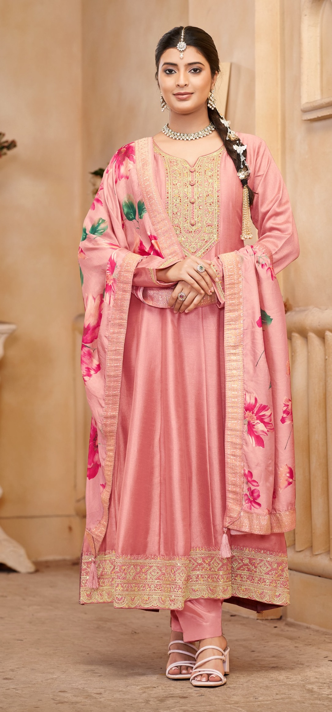 Light Peach Vichitra Silk Sequence Embroidered Semi-Stitched Salwar Suit