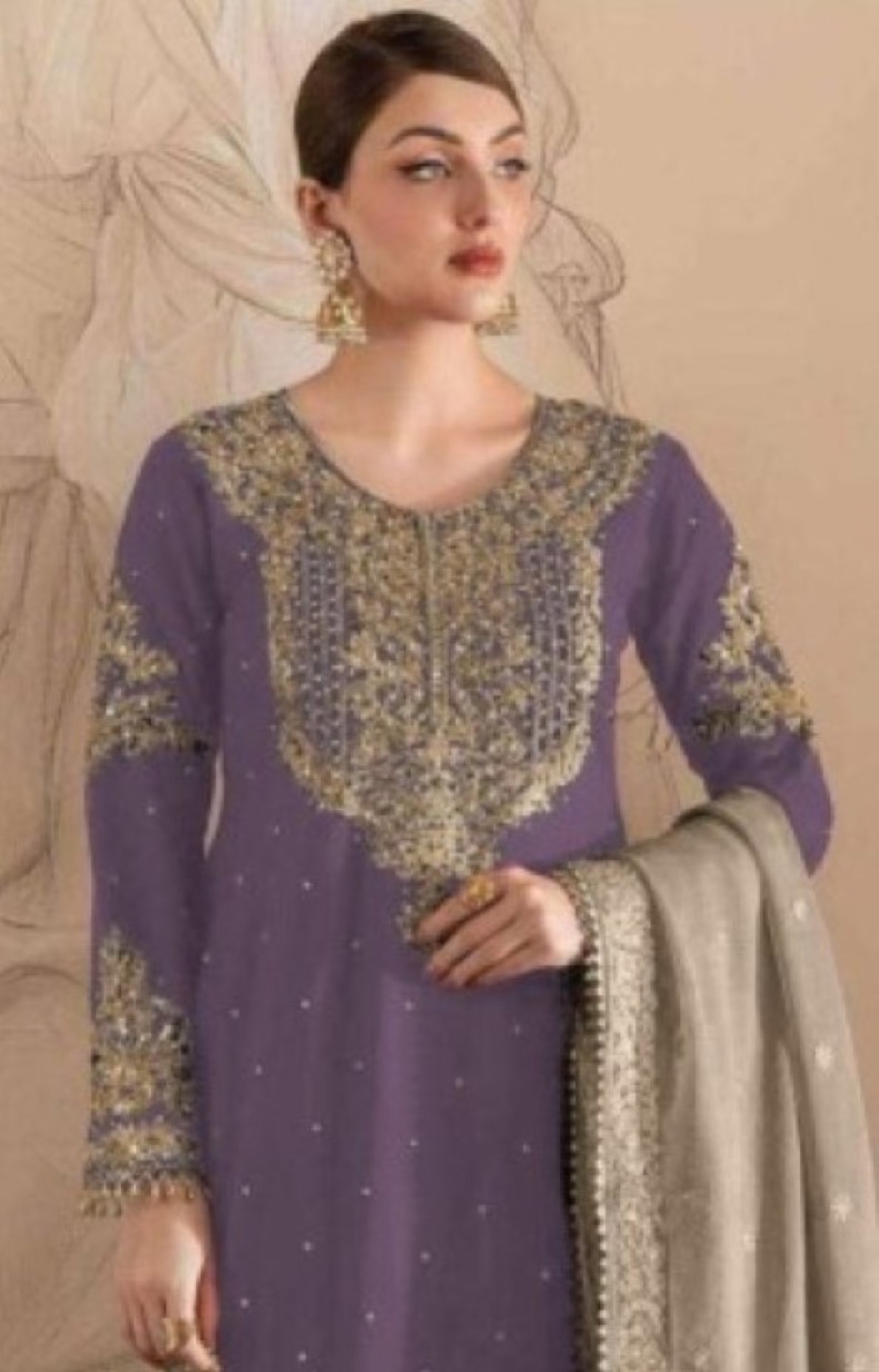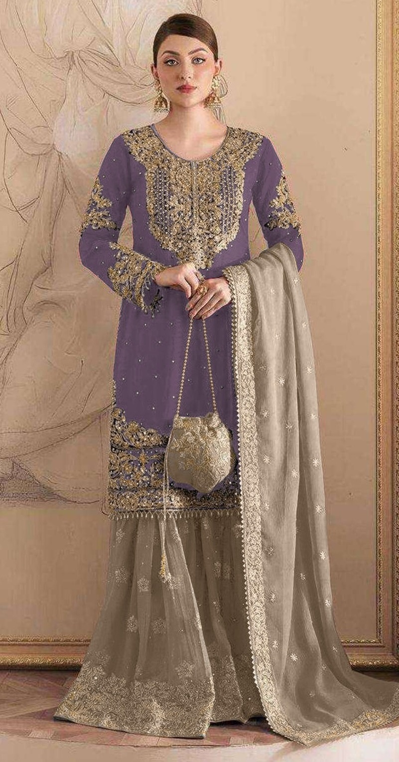 Light Purple Embroidered Faux Georgette with Sequence Work Semi Stitched Sharara Suit