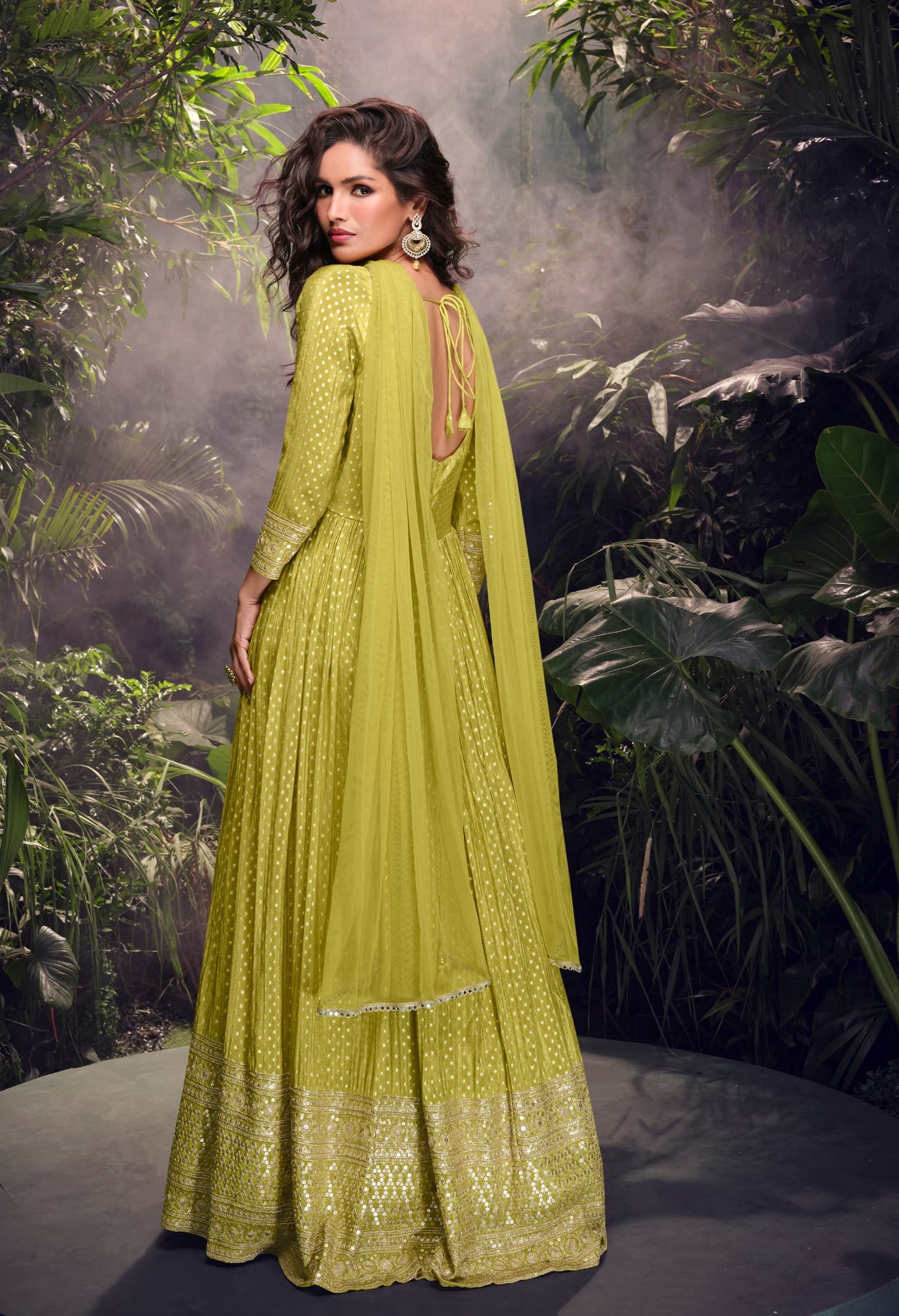 lime Viscose Simar Jacquard Stiched Hand Made Khatli Work Anarkali Gown (Free Size)