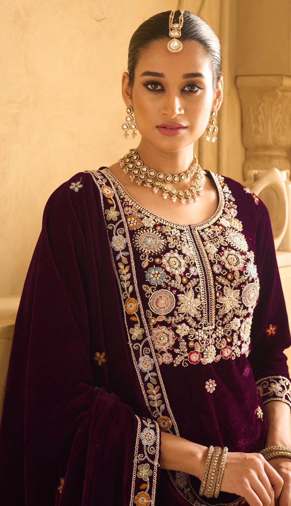 Maroon Embroderied Work Velvet Semi-Stitched Plazo Suit