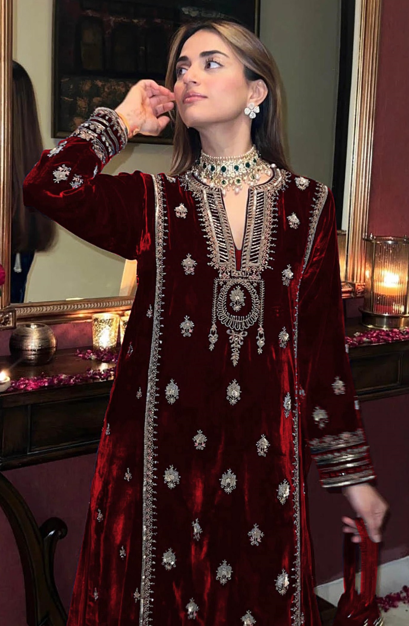 Maroon Embroidered 9000 Velvet Semi Stitched Salwar Suit