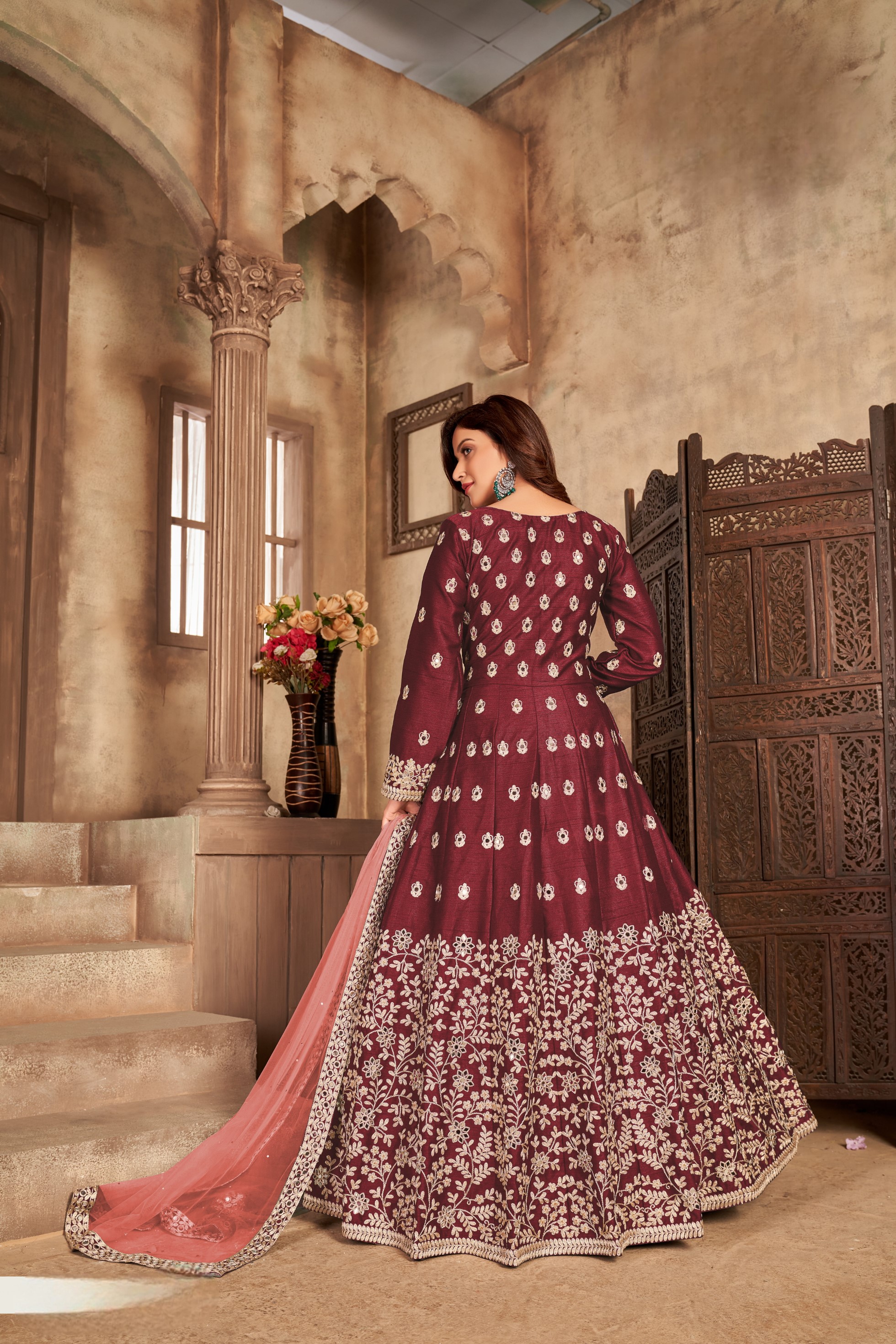 Maroon Embroidered Art Silk Semi Stitched Anarkali Suit