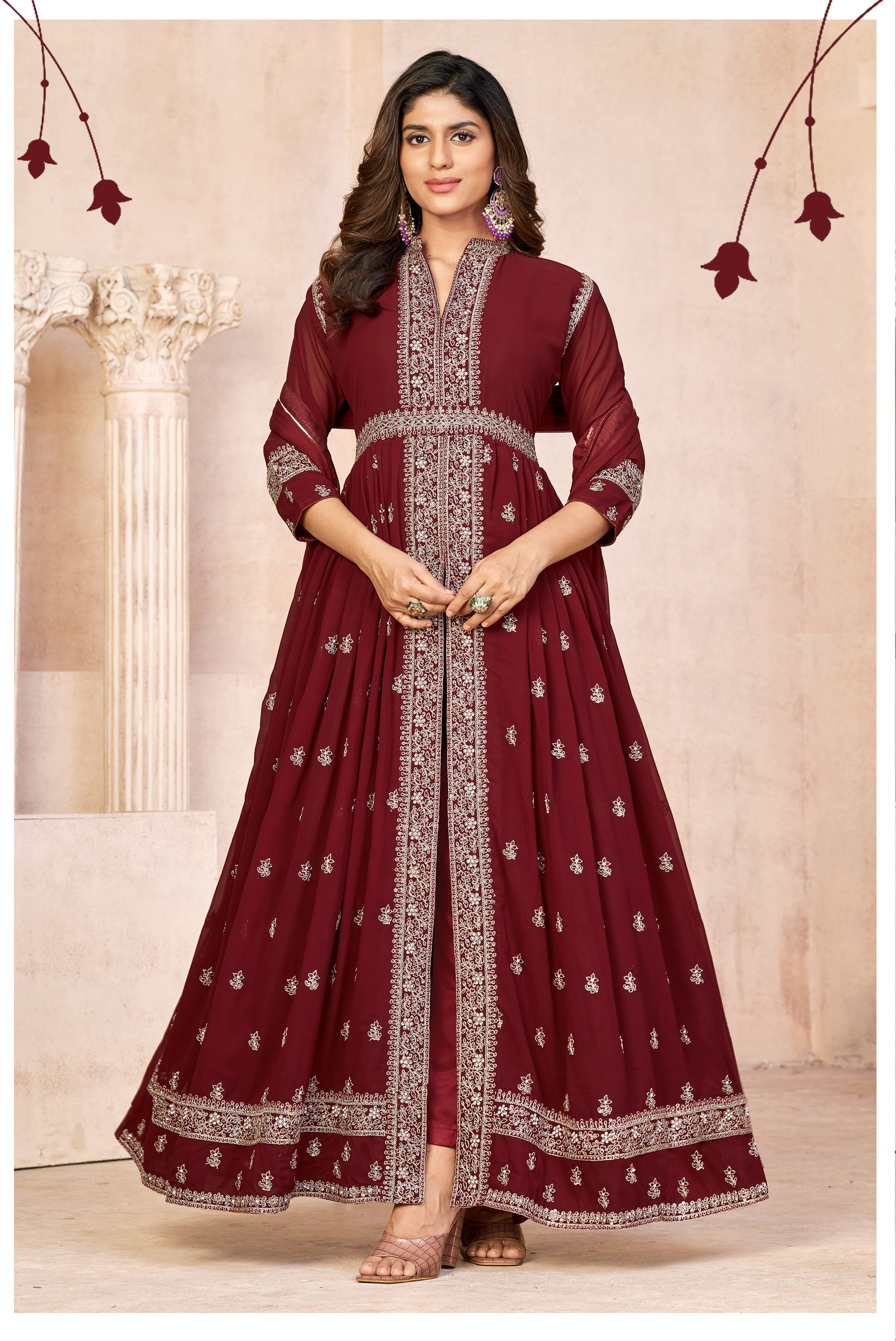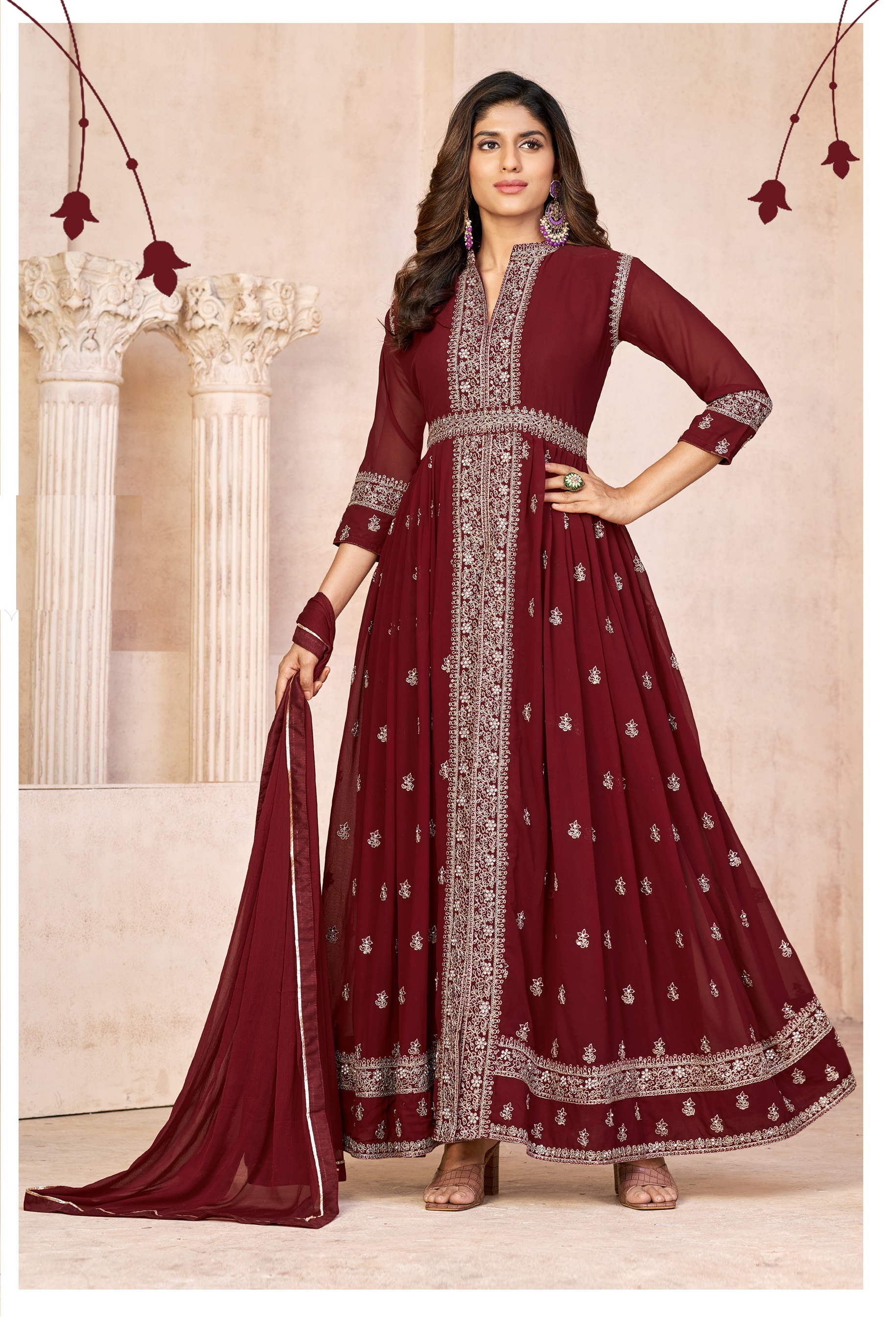 Maroon Embroidered Faux Georgette Semi Stitched Anarkali Suit