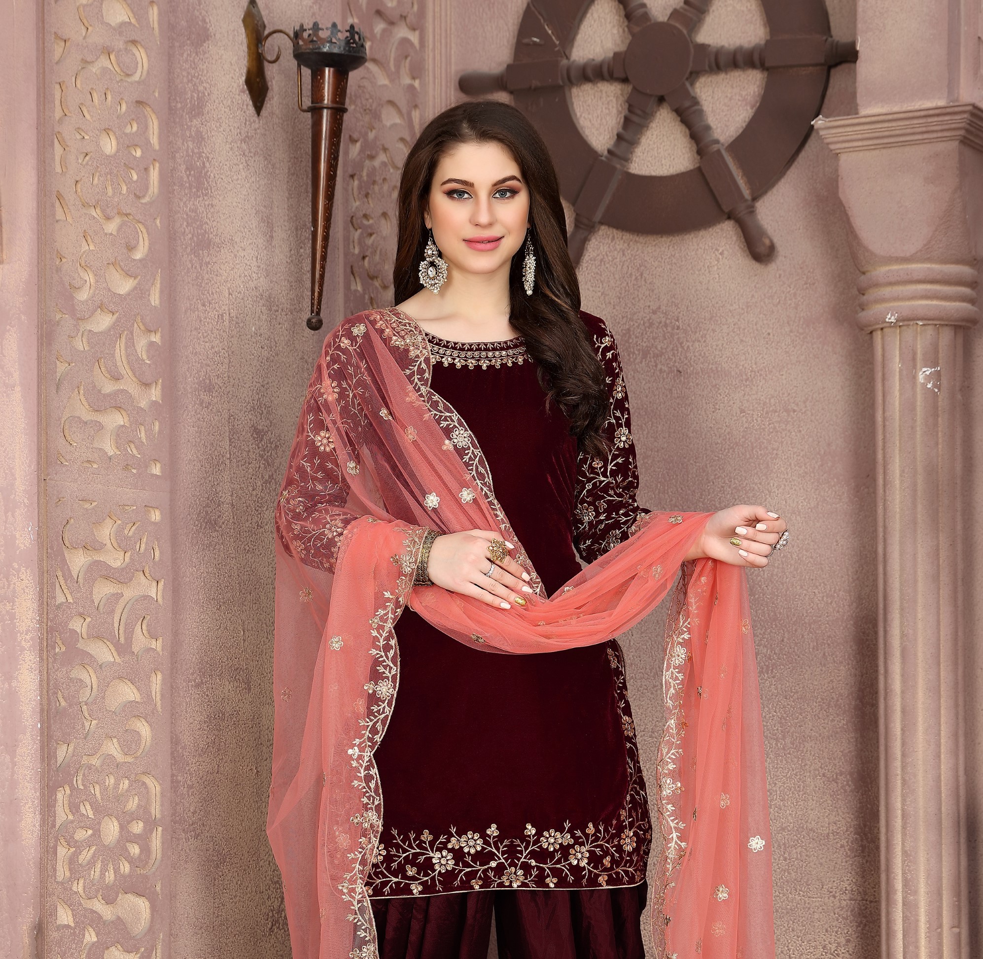 Maroon Embroidered Velvet Semi Stitched Anarkali Suit