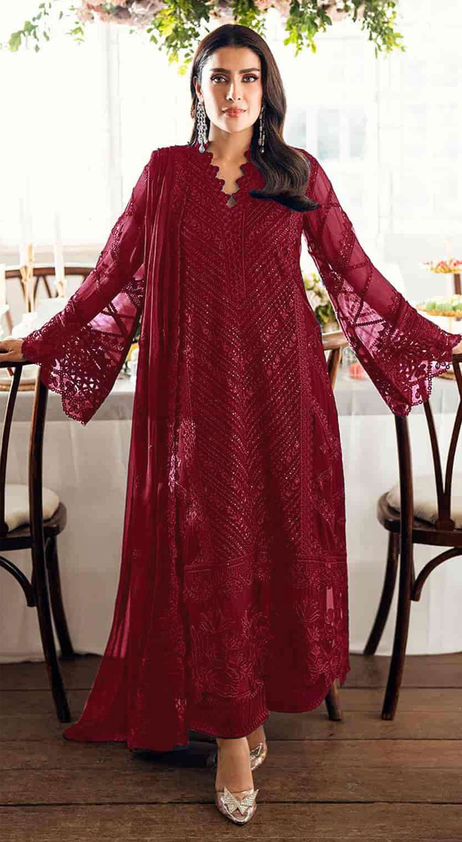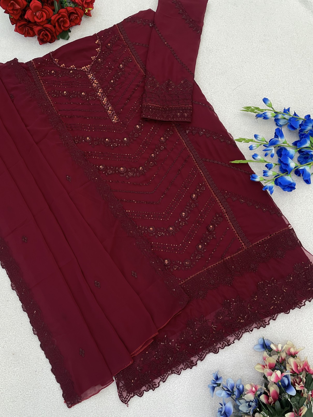Maroon Georgette Semi Stitched Suit with Embroidered Sequence & Khatli Work