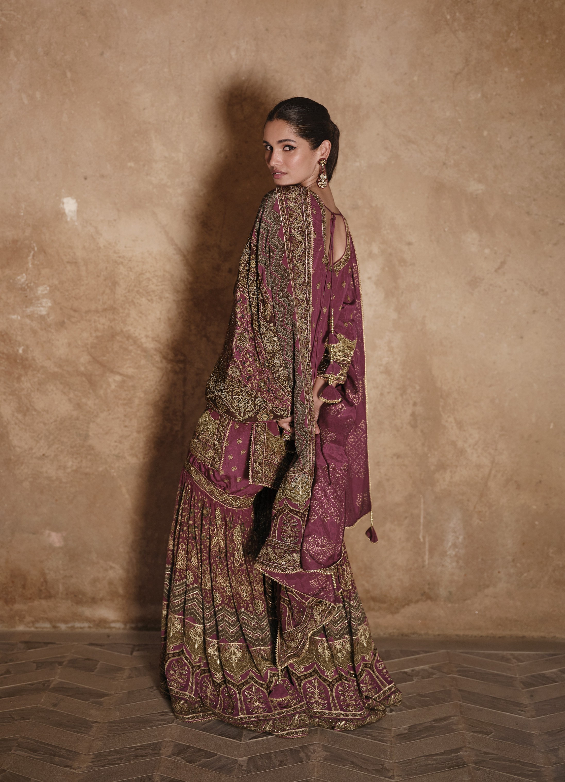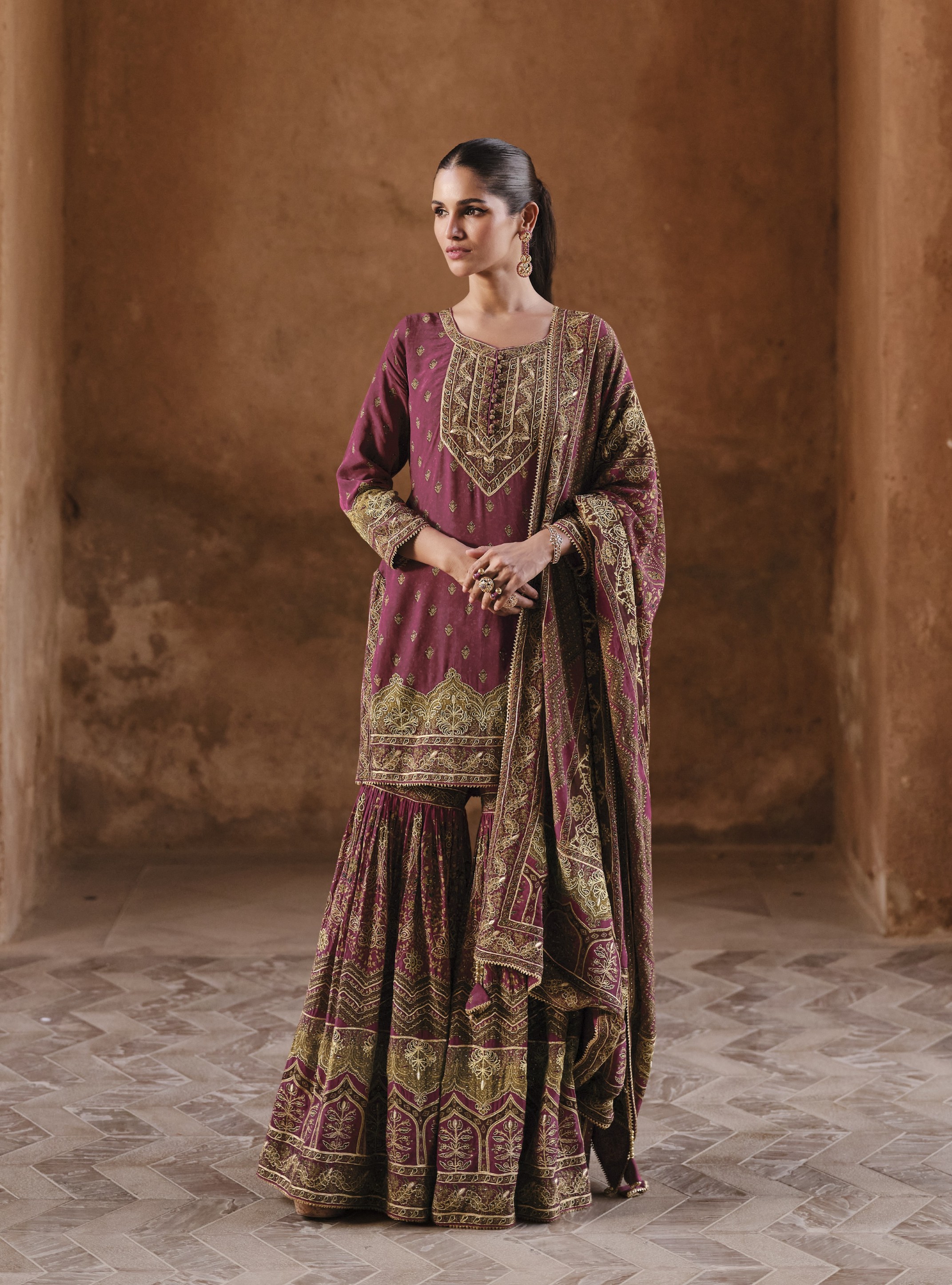 Maroon Silk Readymade Palazzo Suit with Swarovski Work