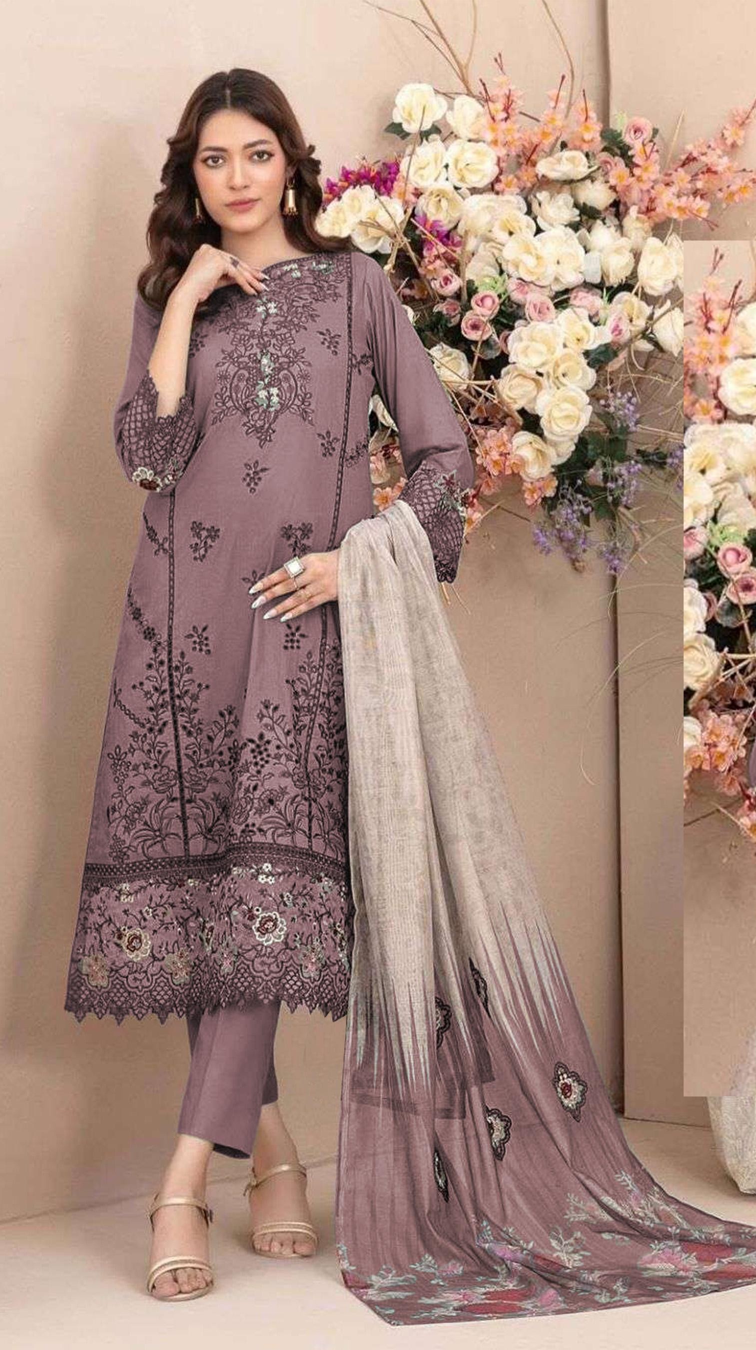 Mauve Cambric Cotton Semi Stitched Suit with Embroidery & Sequence Work