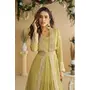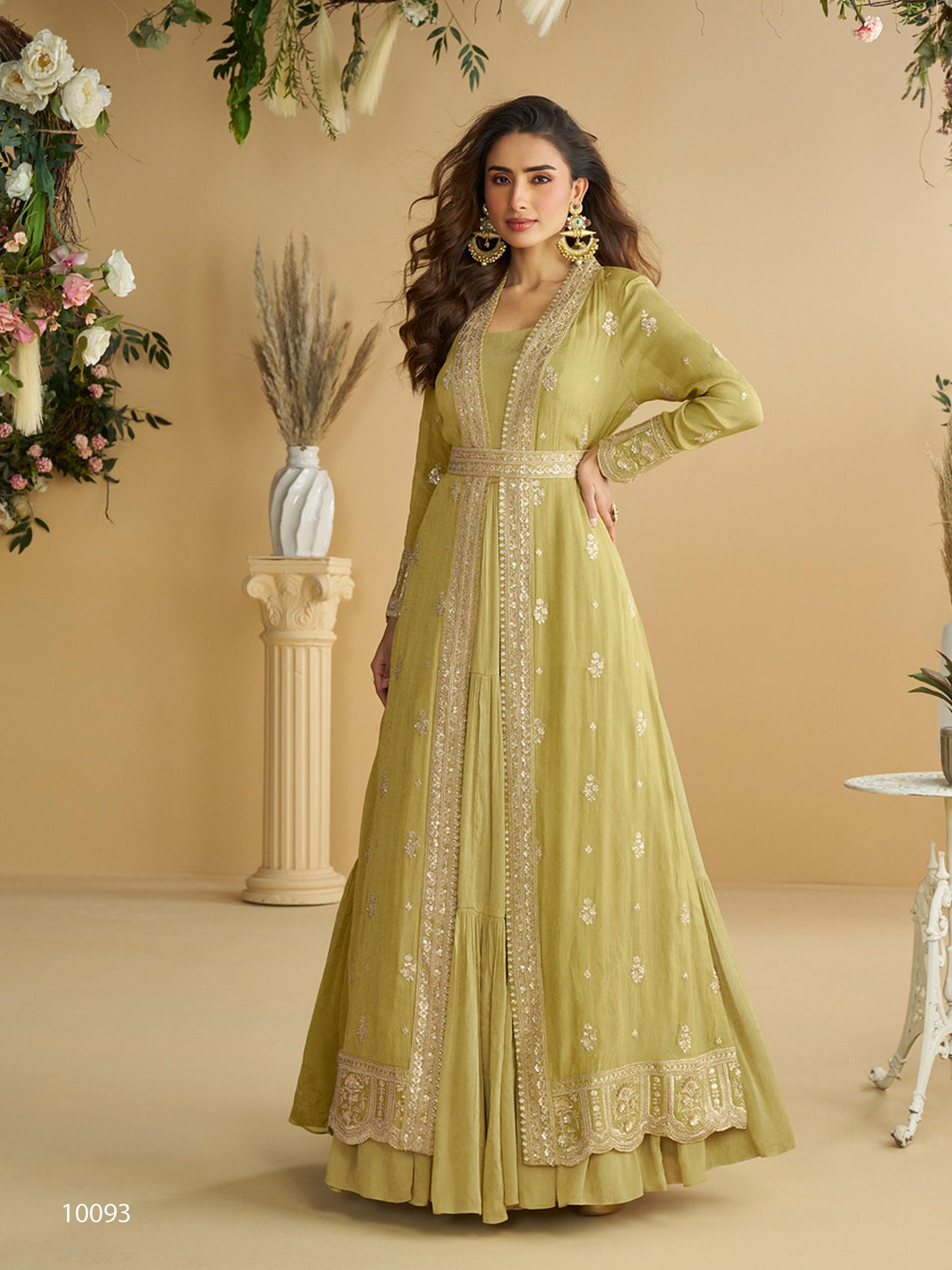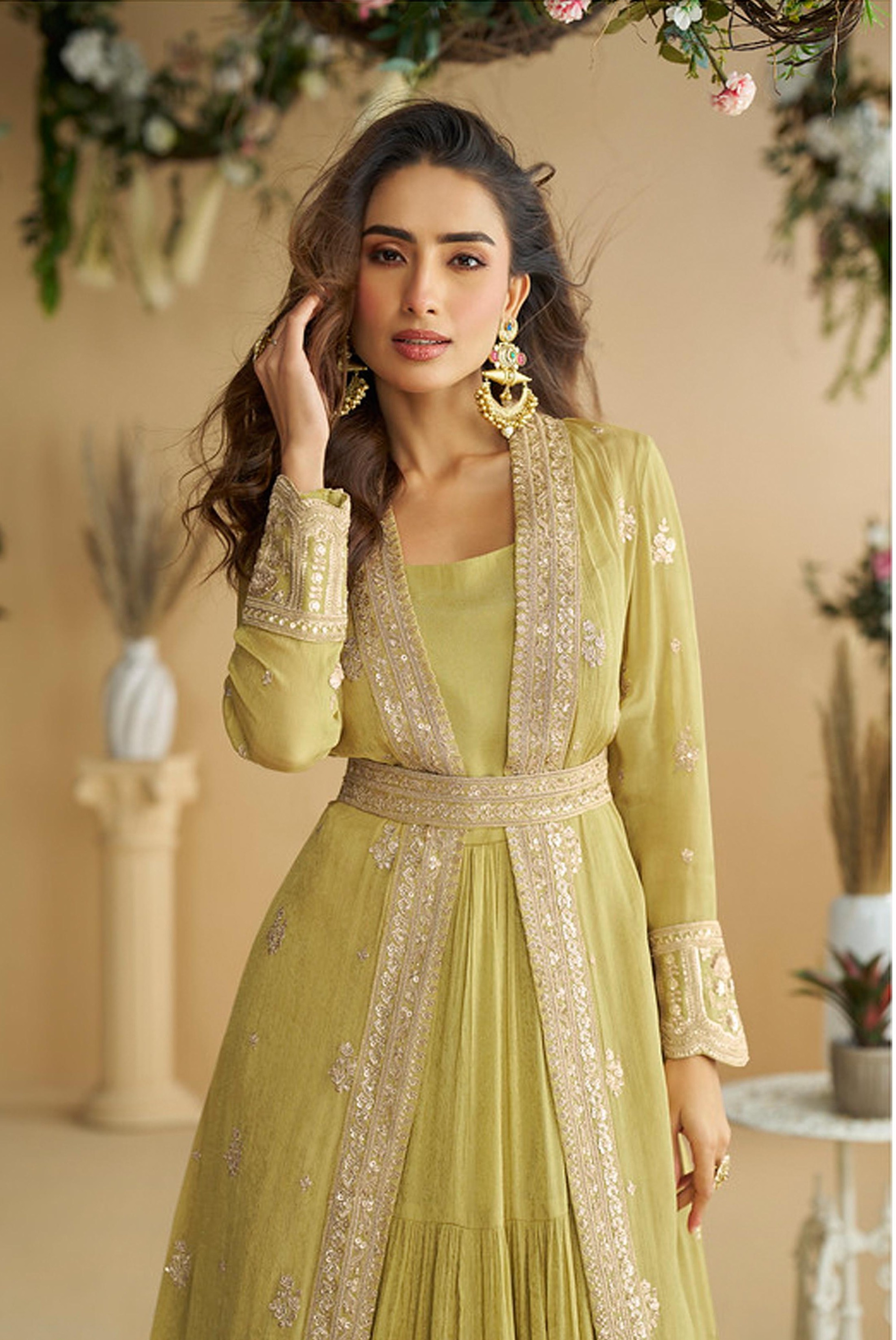 Mustard Chinon Silk Readymade Anarkali Shrug Gown with Belt & Embroidery Work