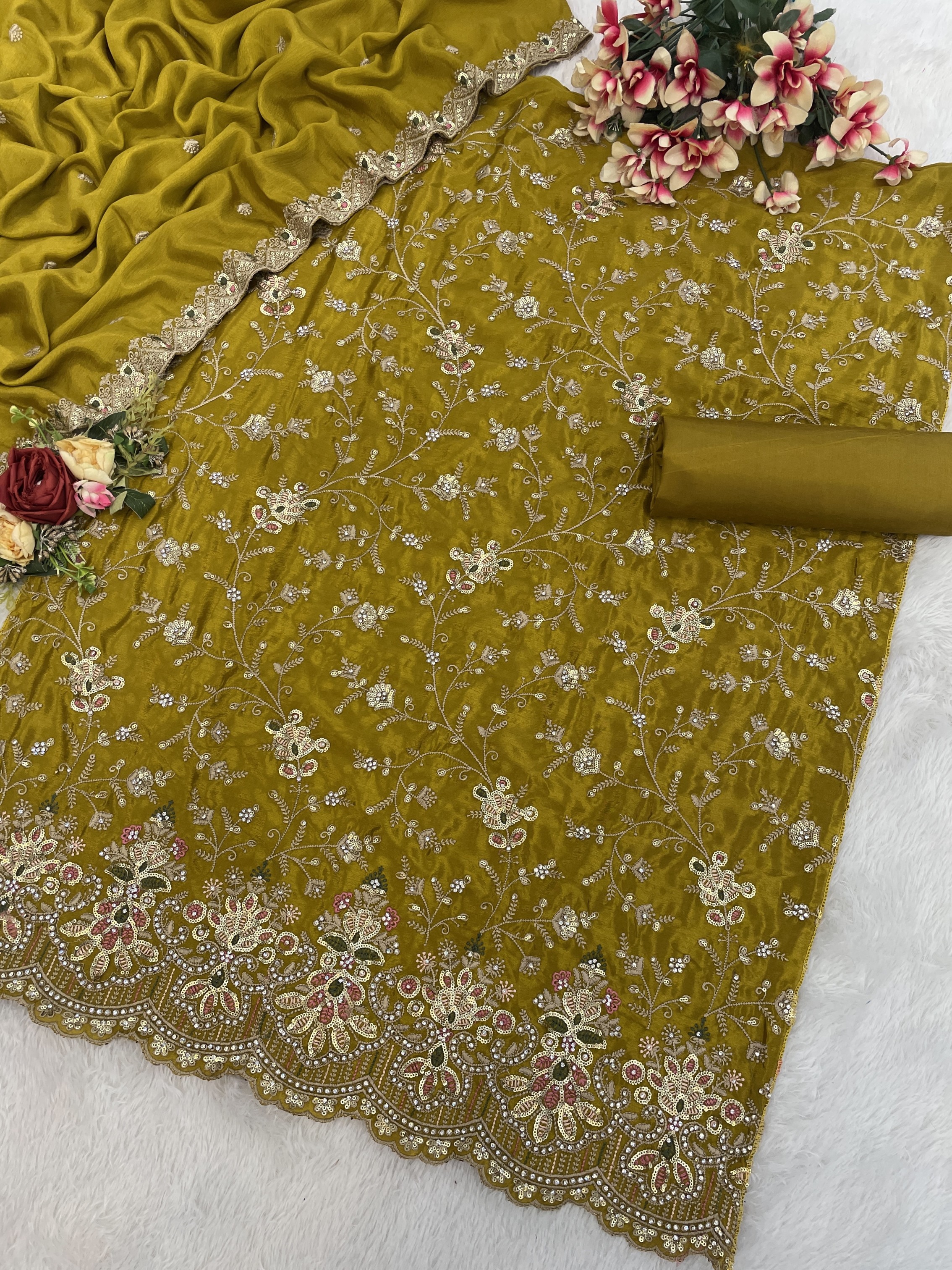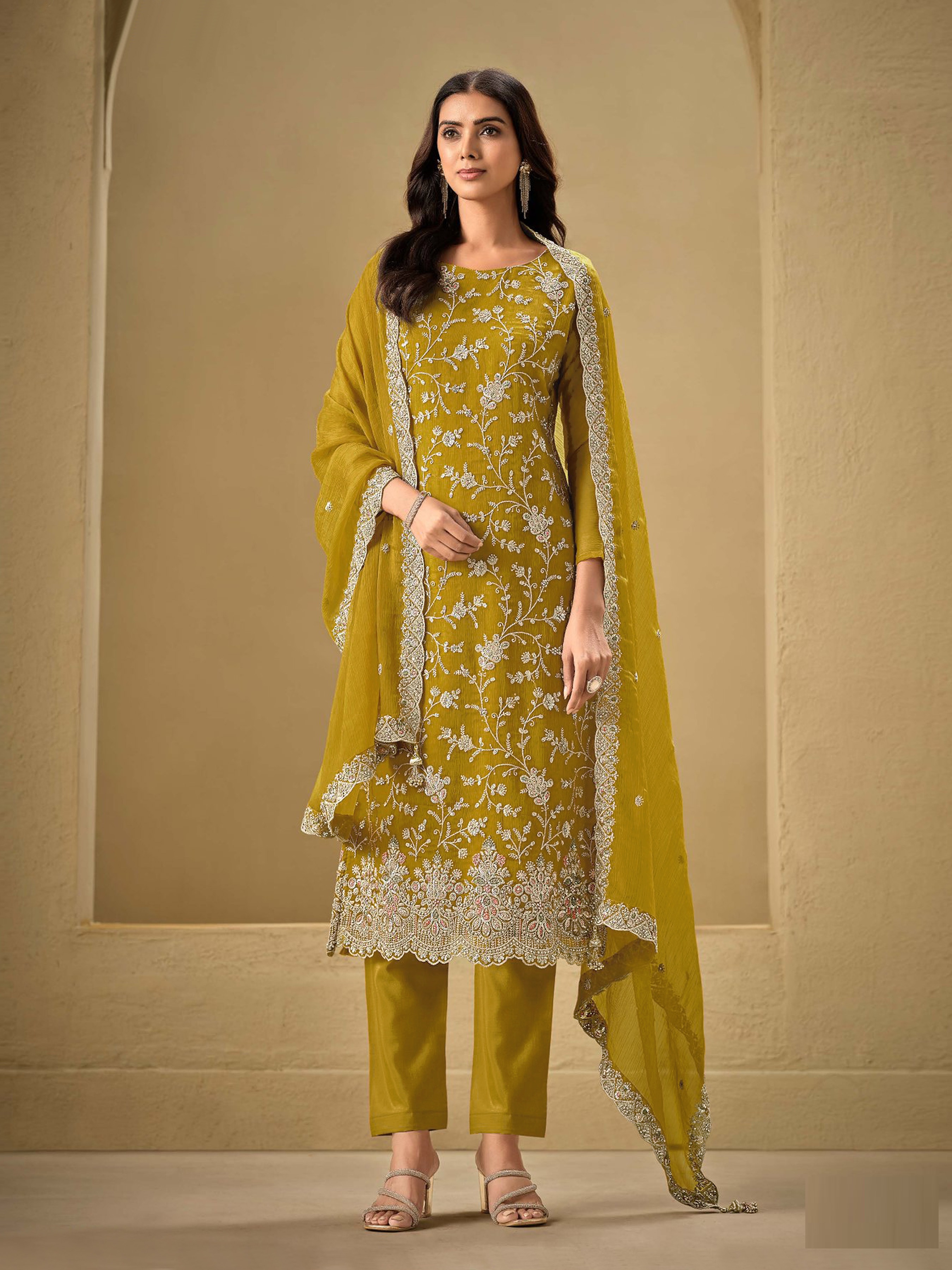 Mustard Embroderied Silk Semi-Stitched Salwar suit