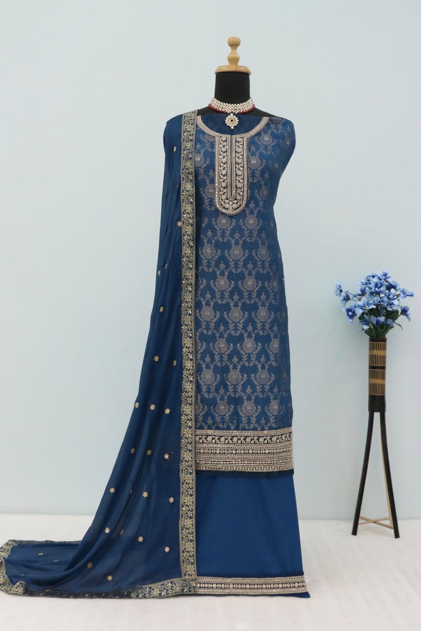Navy Blue Dola Silk Thread Sequence Embroidered Semi-Stitched Salwar Suit