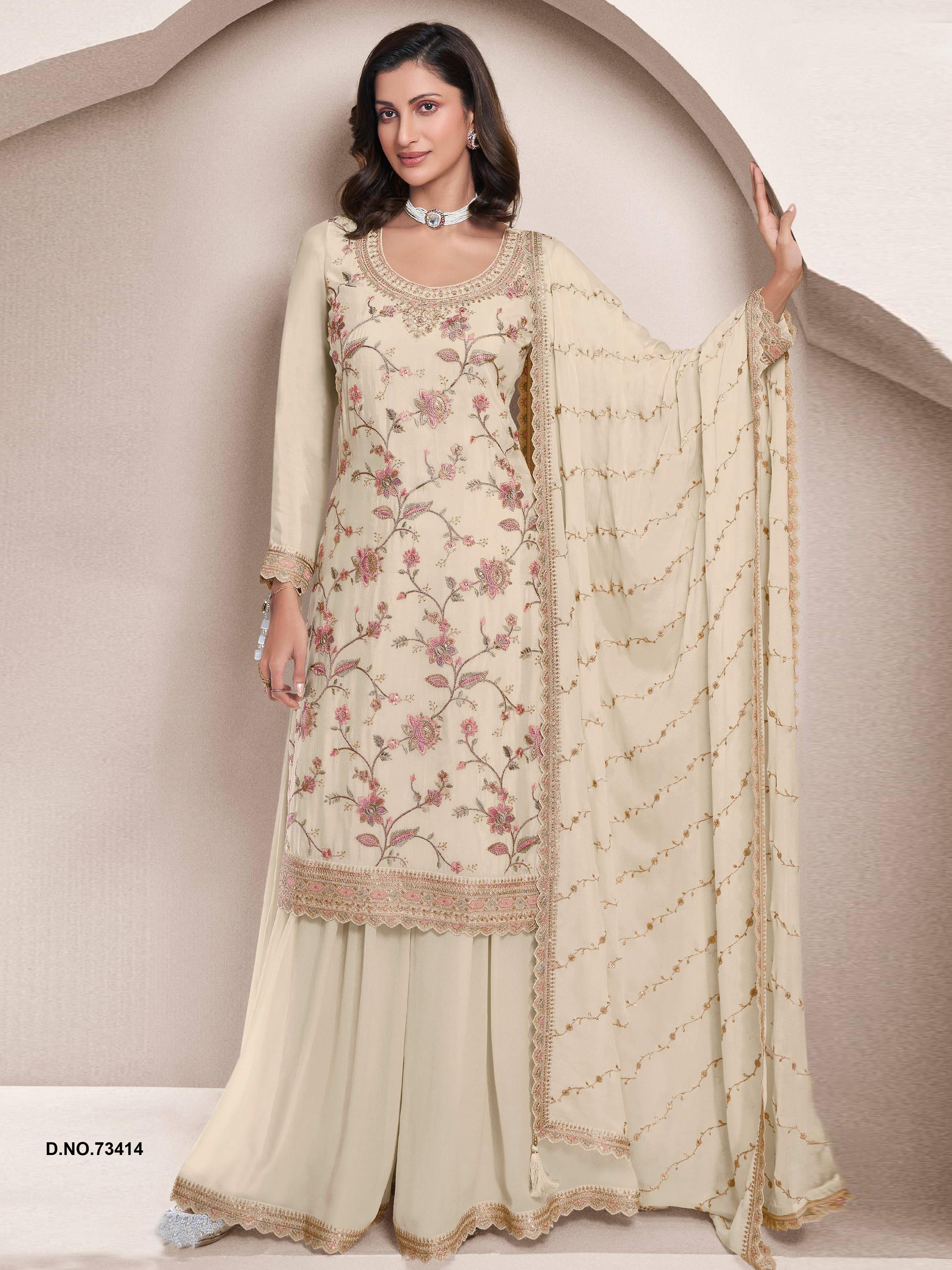 Off White Heavy Chinon With Embroidery Sharara Suit (bottom Stitched)