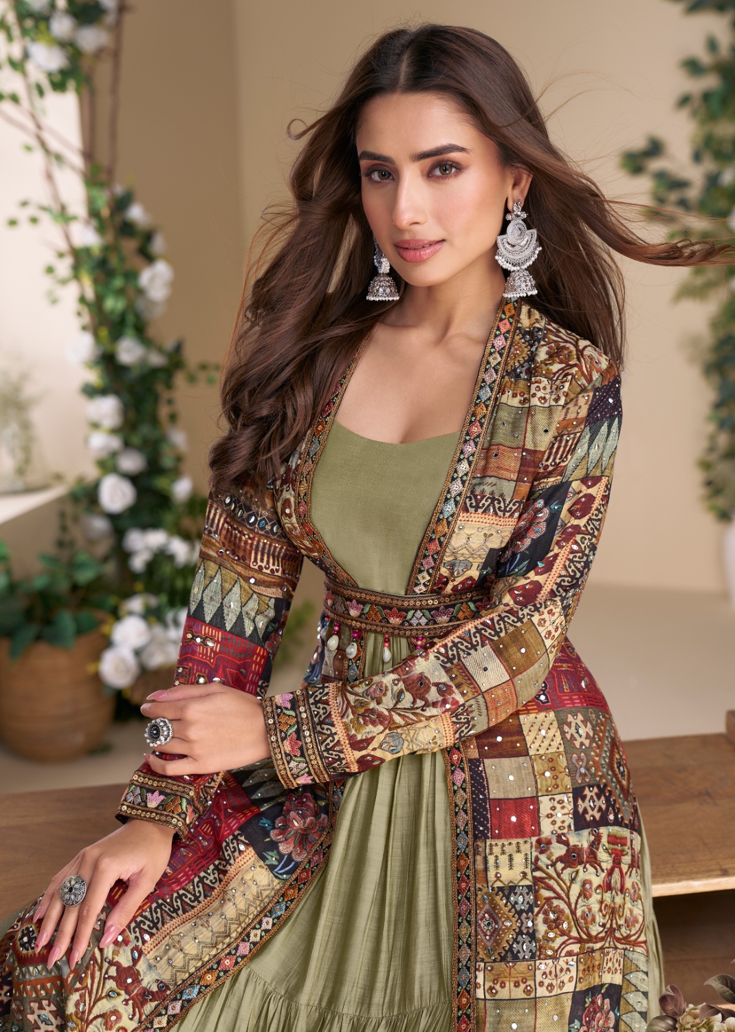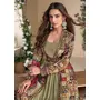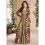 Olive heavy fox georgette free size anarkali shrug suit with silk print