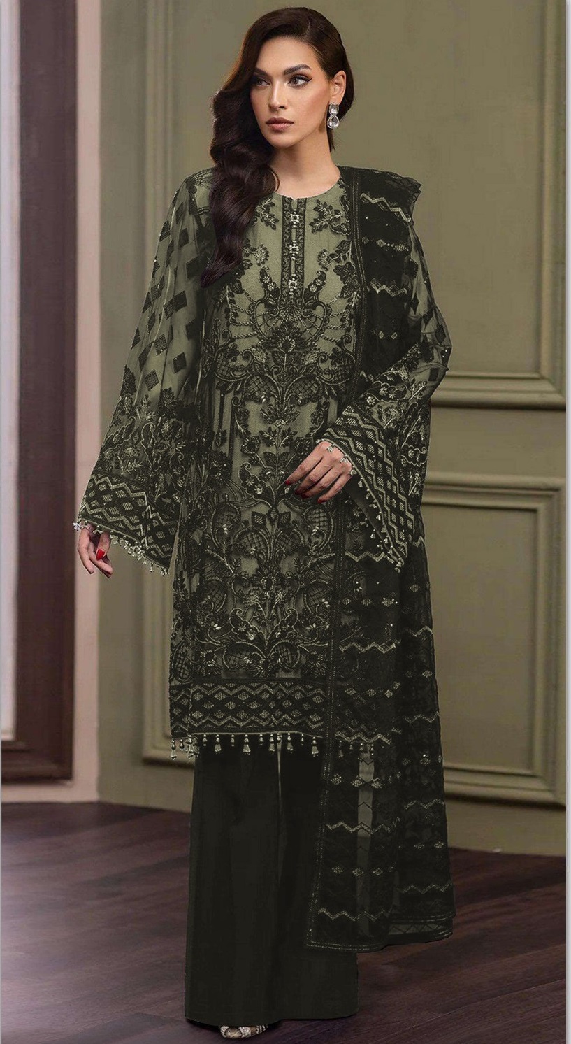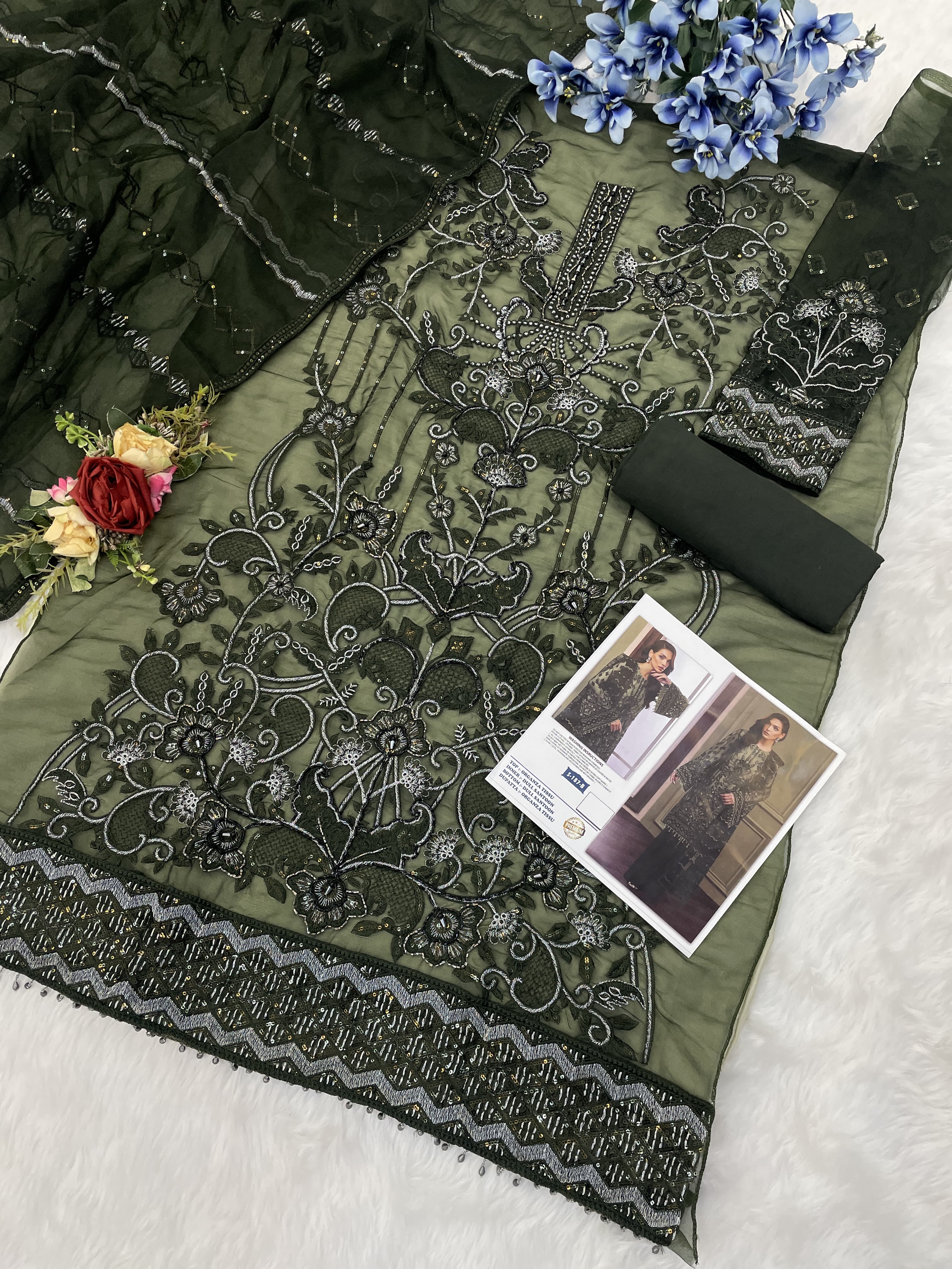 Olive Heavy Organza With Embroidery And Khatli Work Salwar Suit