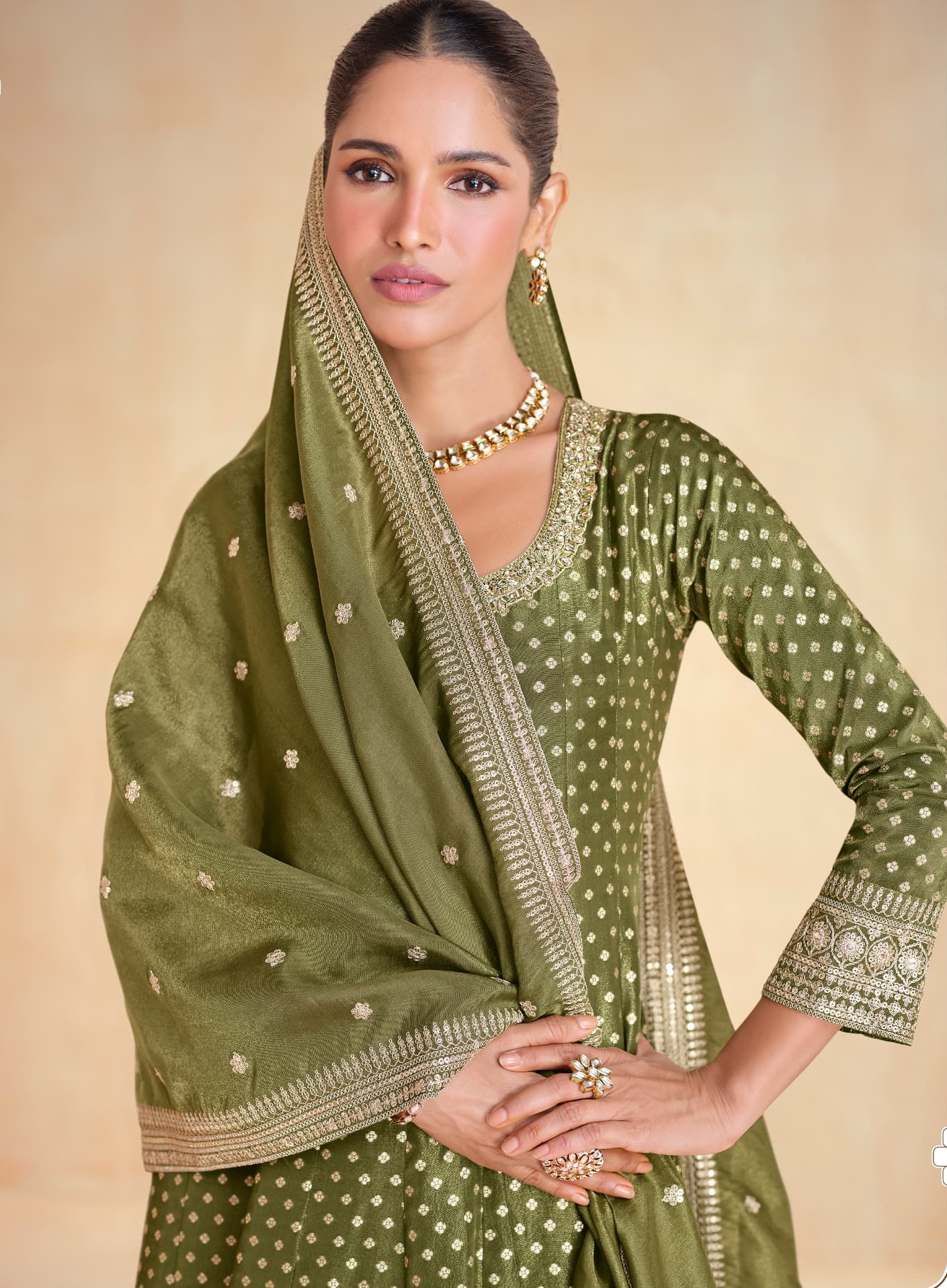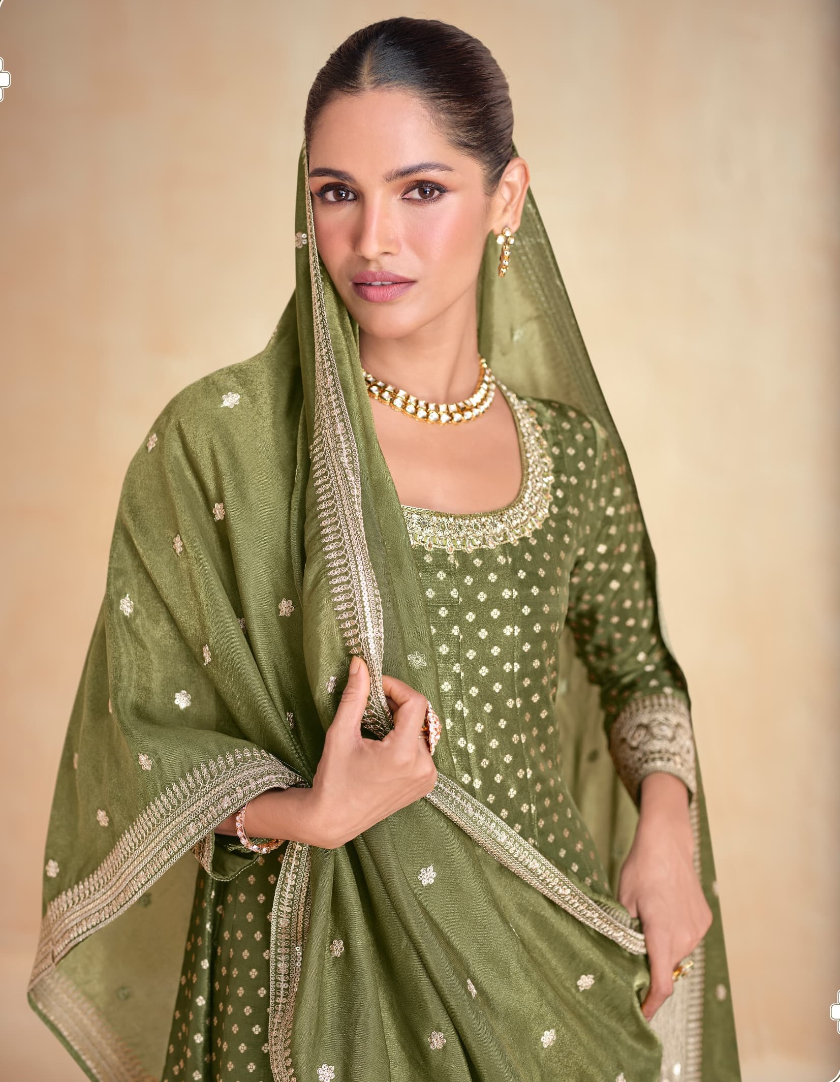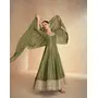 Oliveb Green embroidered viscose jacquard free Size stitched anarkali suit