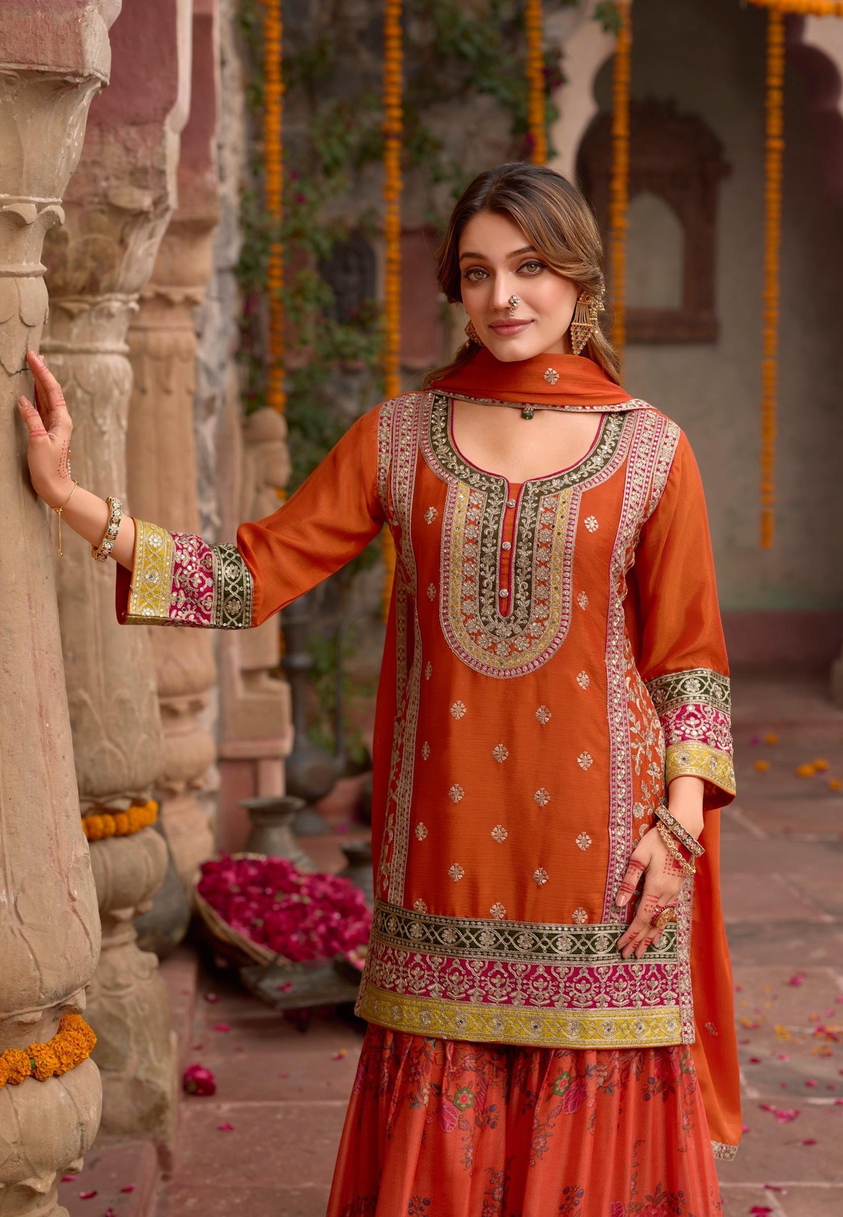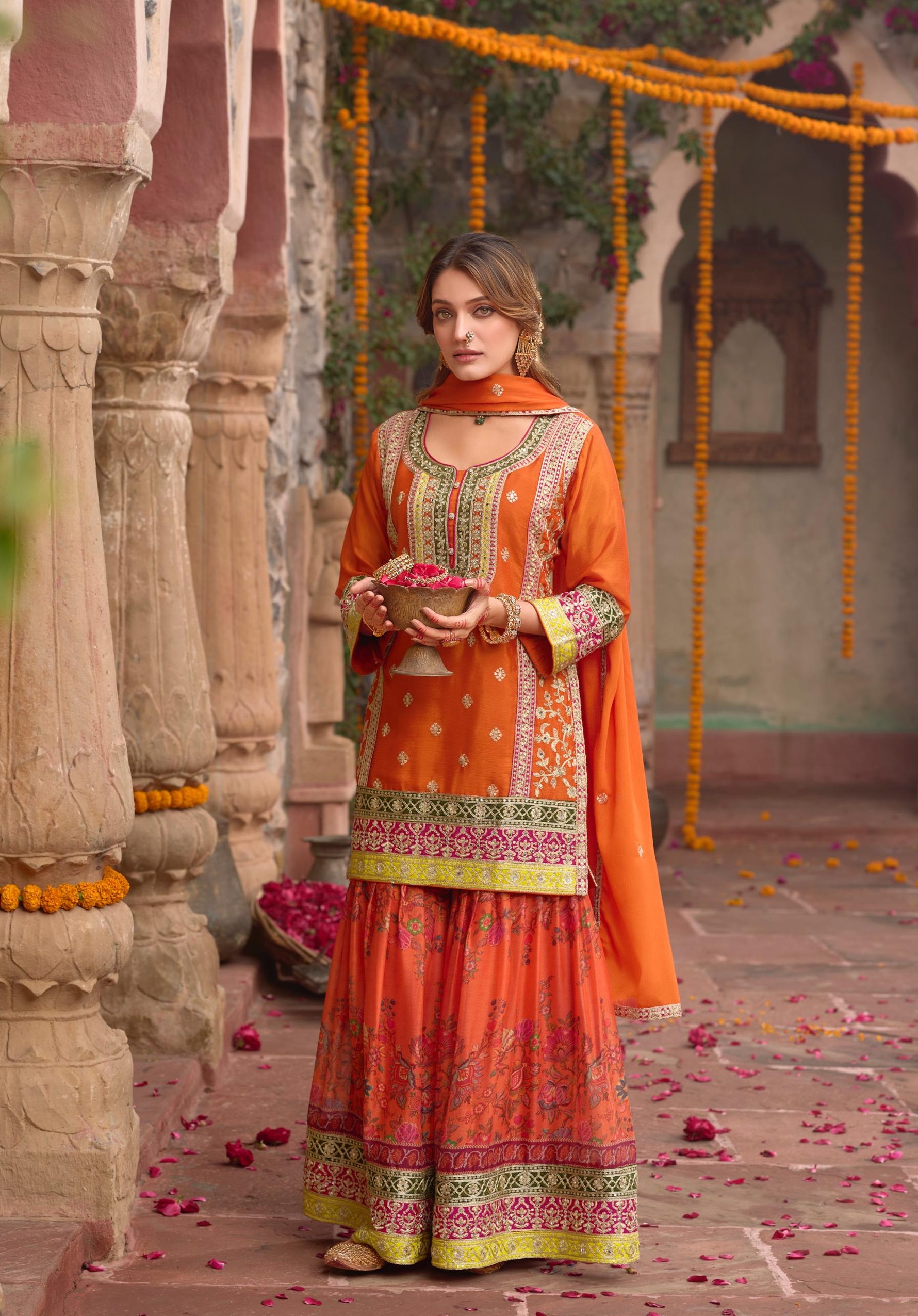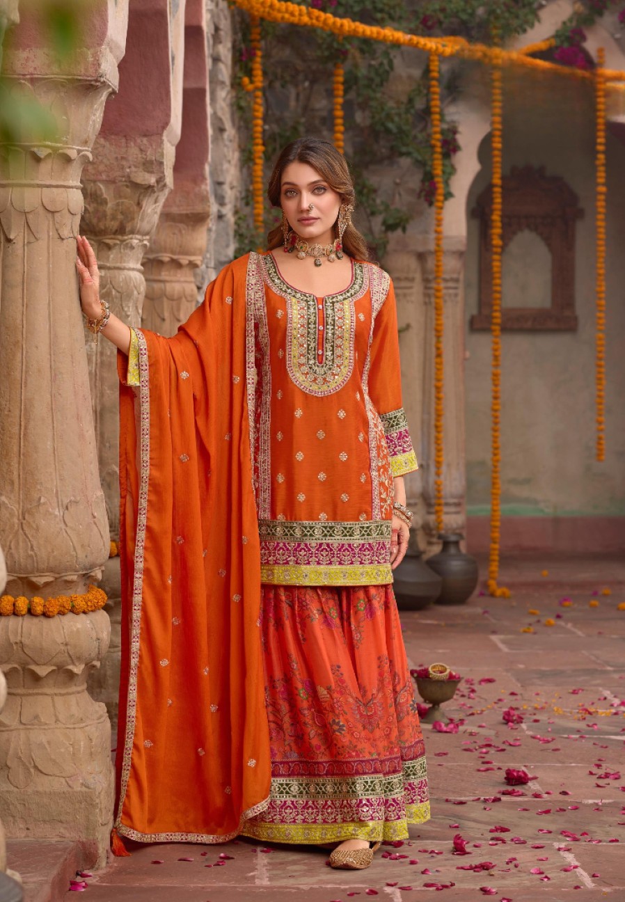 Orange Chinon Readymade Palazzo Suit with Codding Dori & Sequence Work