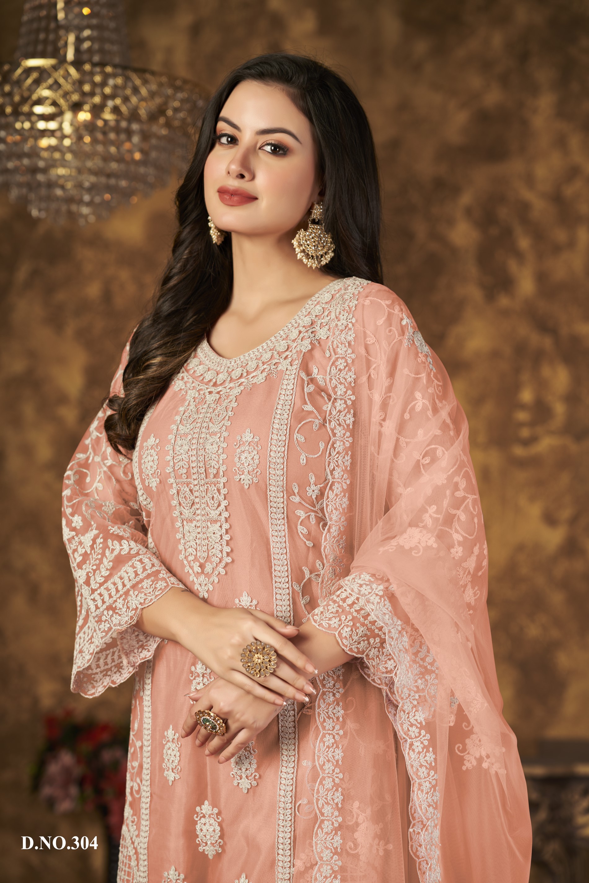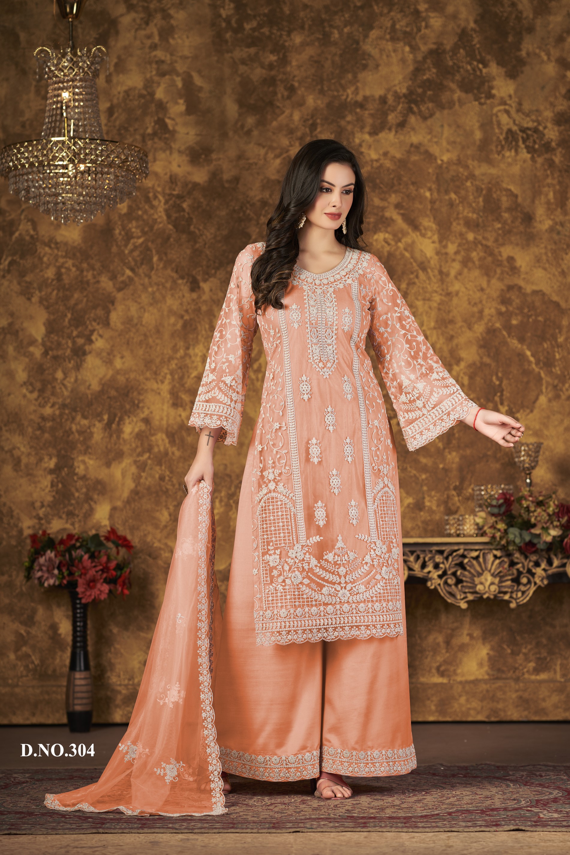 Orange Embroidered Net Semi Stitched Plazzo Suit