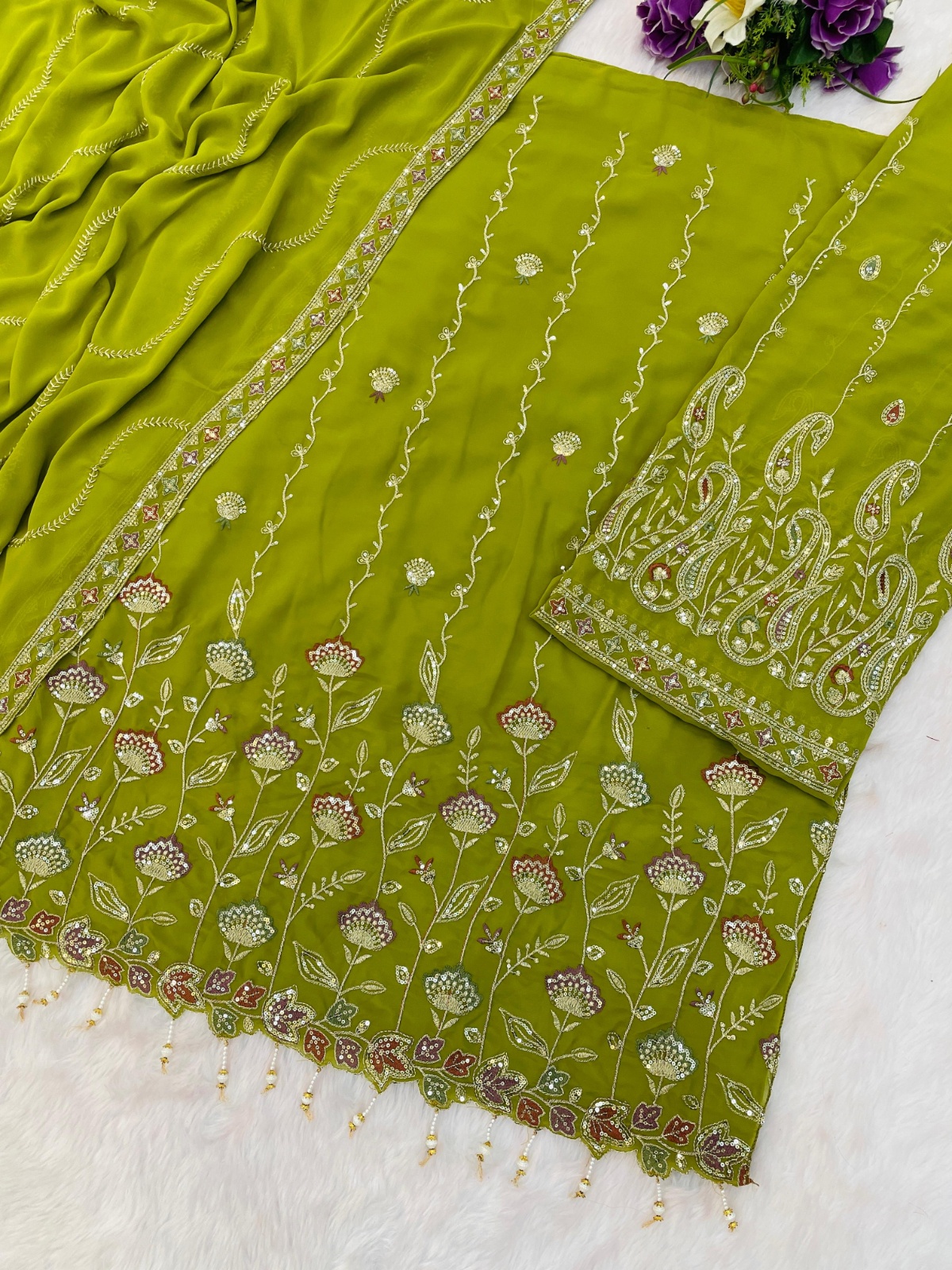 Parrot Green Heavy Fox Georgette Semi Stitched Suit With Embroidery Work