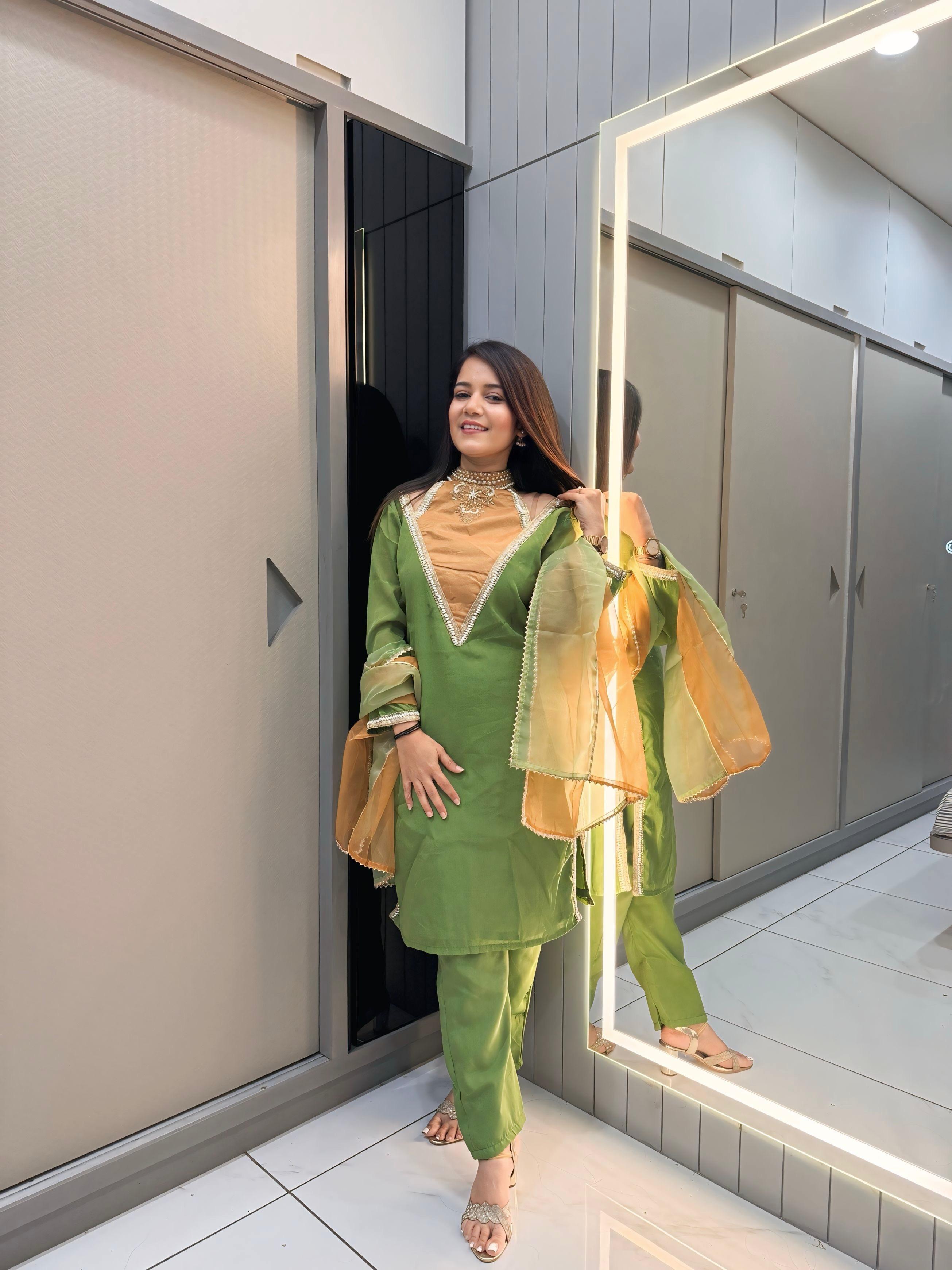 Parrot-Green Roman Shimmer Readymade Kurti Set with Designer Handwork