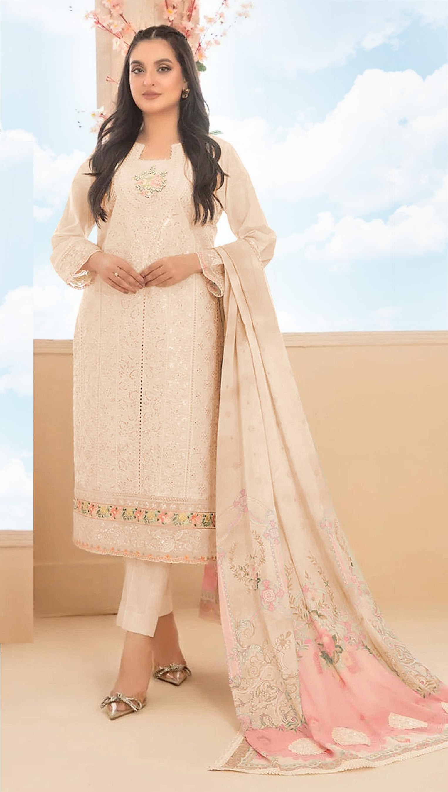 Peach Cambric Cotton Semi Stitched Suit with Embroidery & Sequence Work