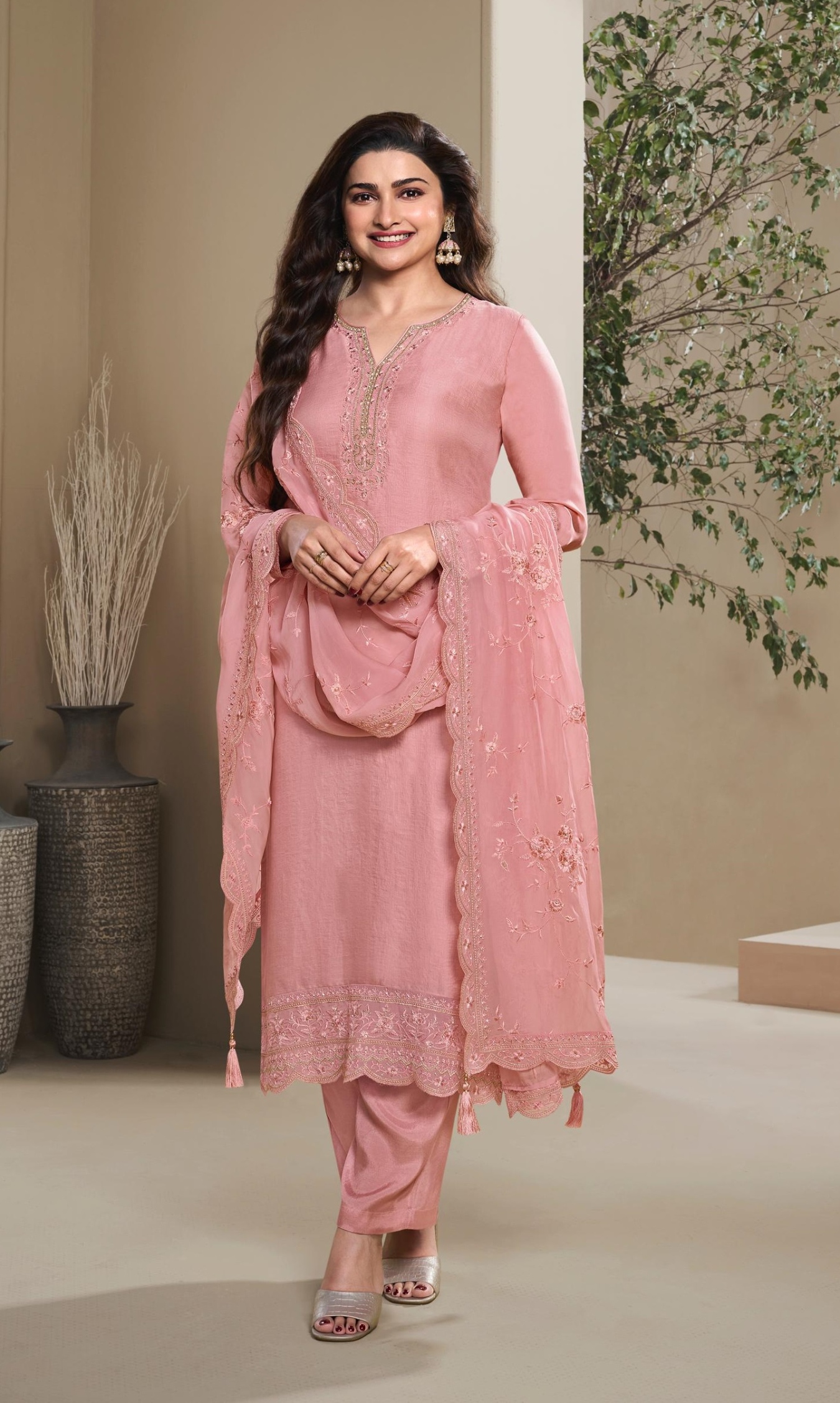 Peach Heavy Natural Crepe Semi Stitched Suit with Embroidery & Zarkhan Work