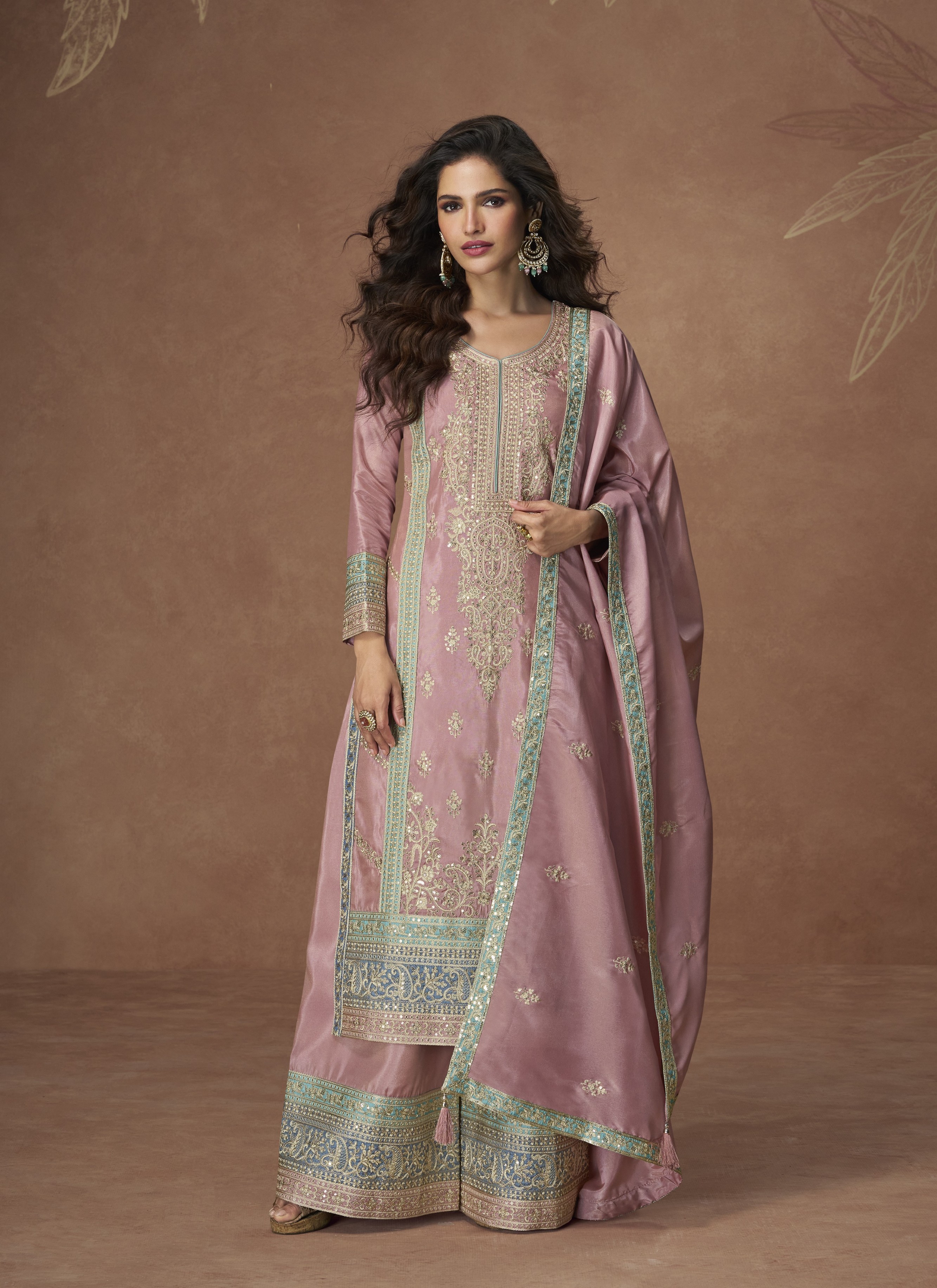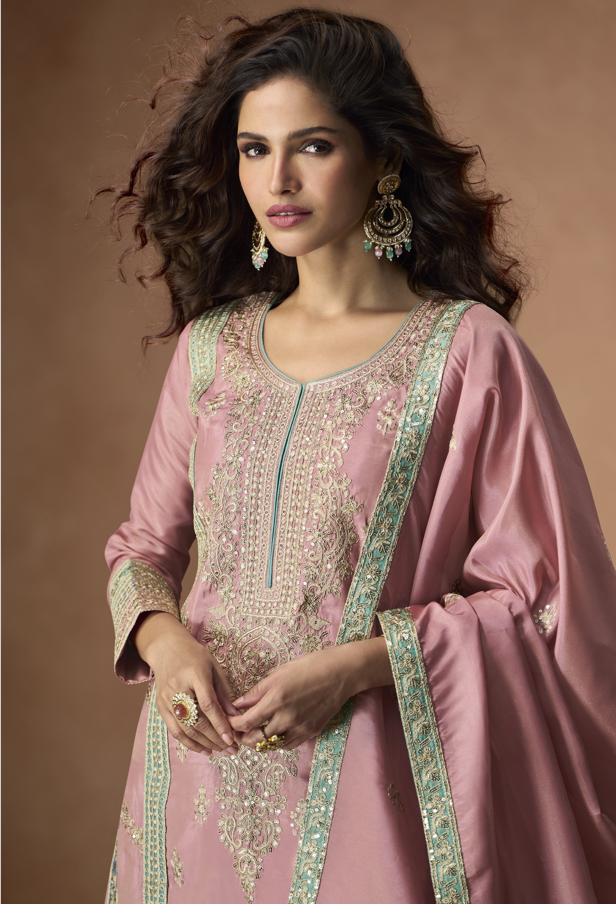 Pink Chinon Readymade Palazzo Suit with Embroidery Sequence Work