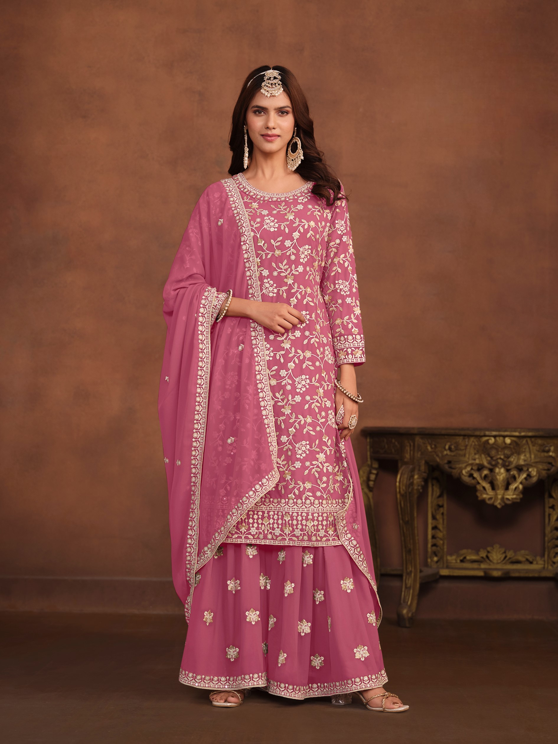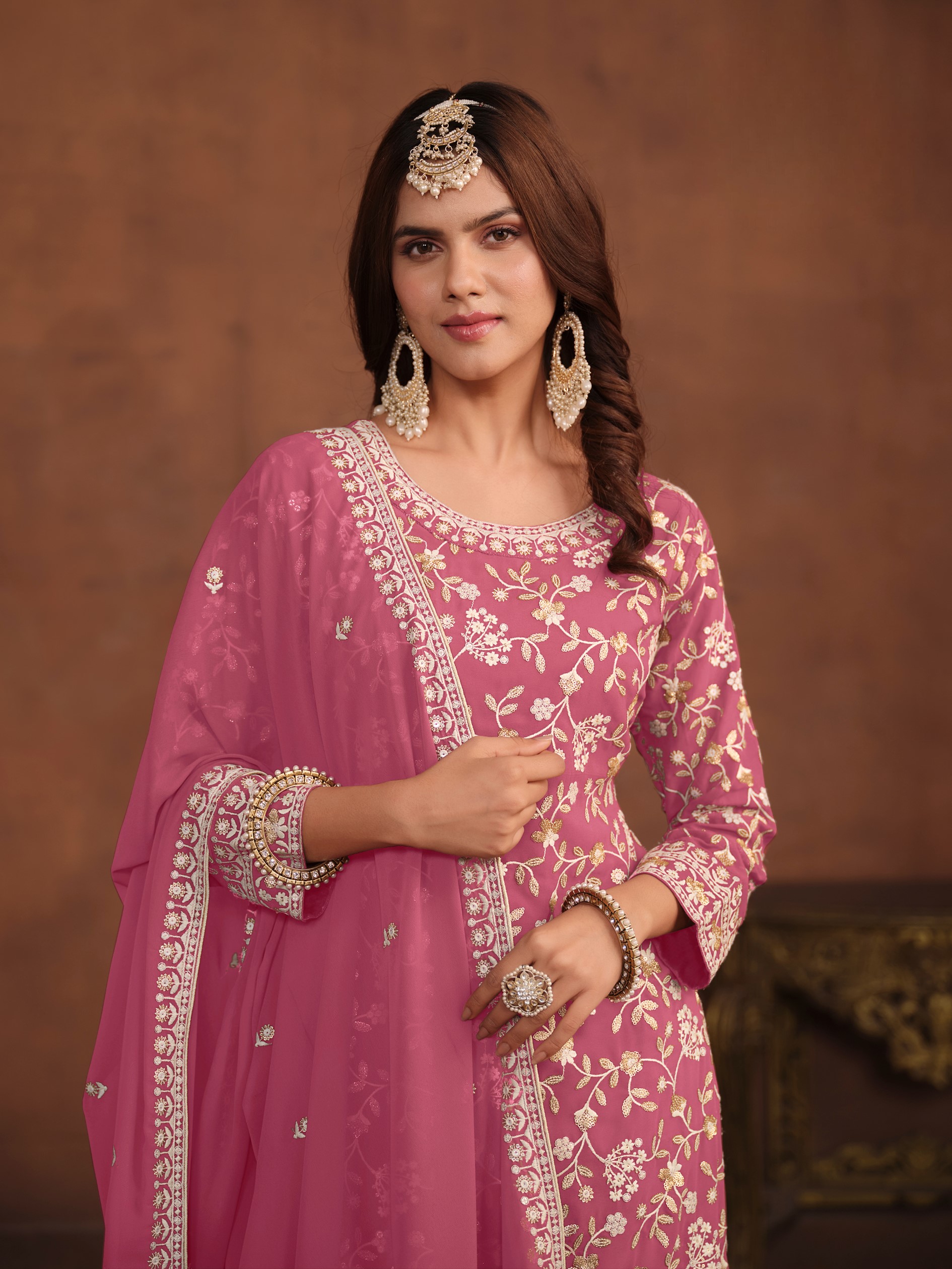 Pink Embroidered Faux Georgette Semi Stitched Salwar Suit