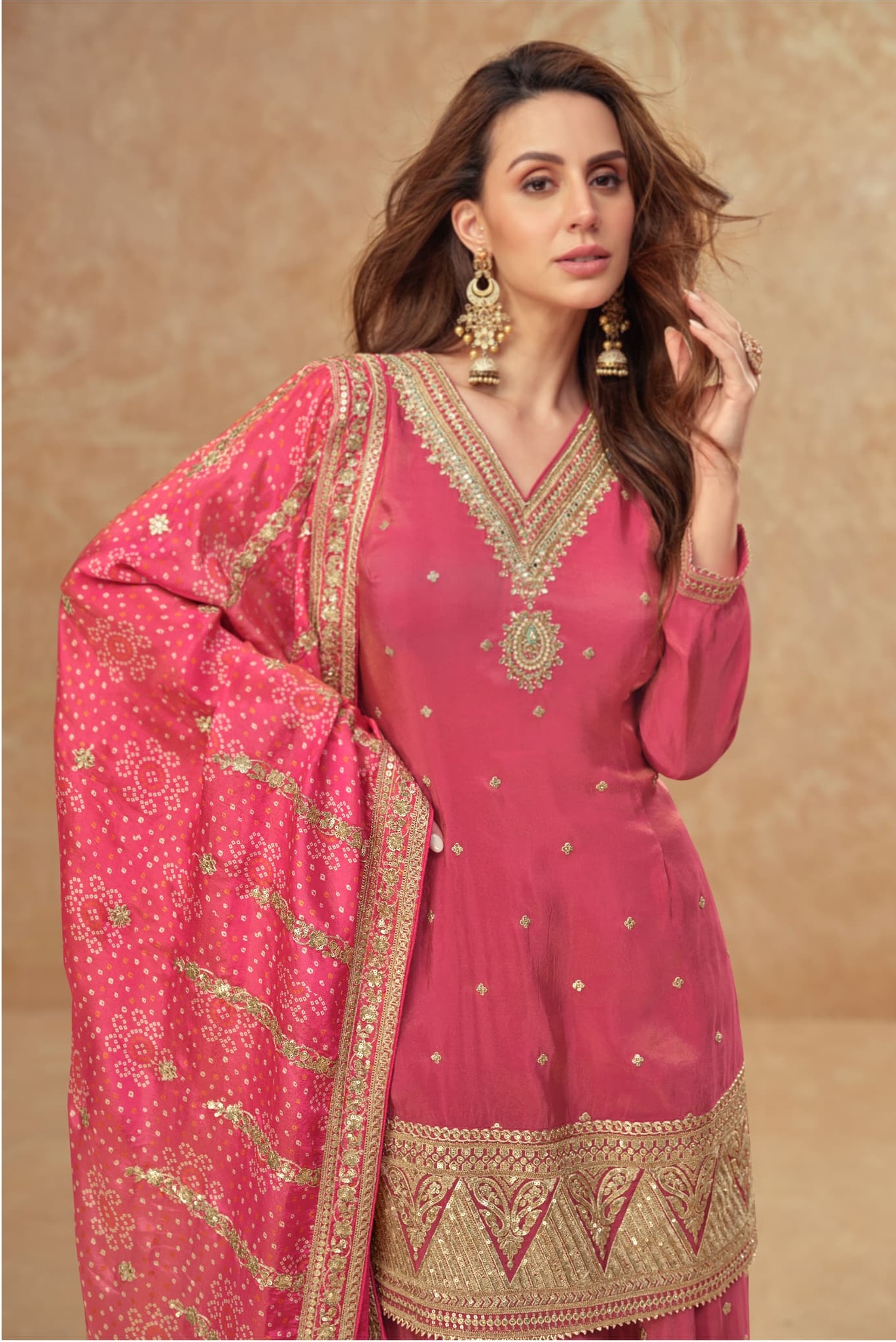 Pink heavy embroidery work cosmos silk sharara suit(ready made)