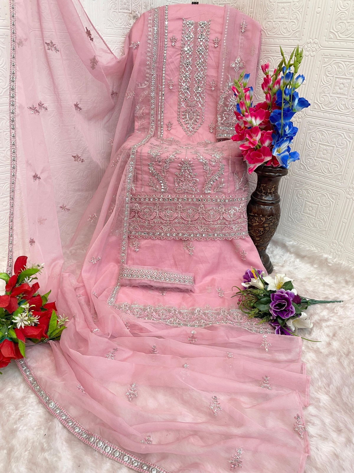 Pink Naylon Organza Semi Stitched Suit With Embroidery & Mirror Work