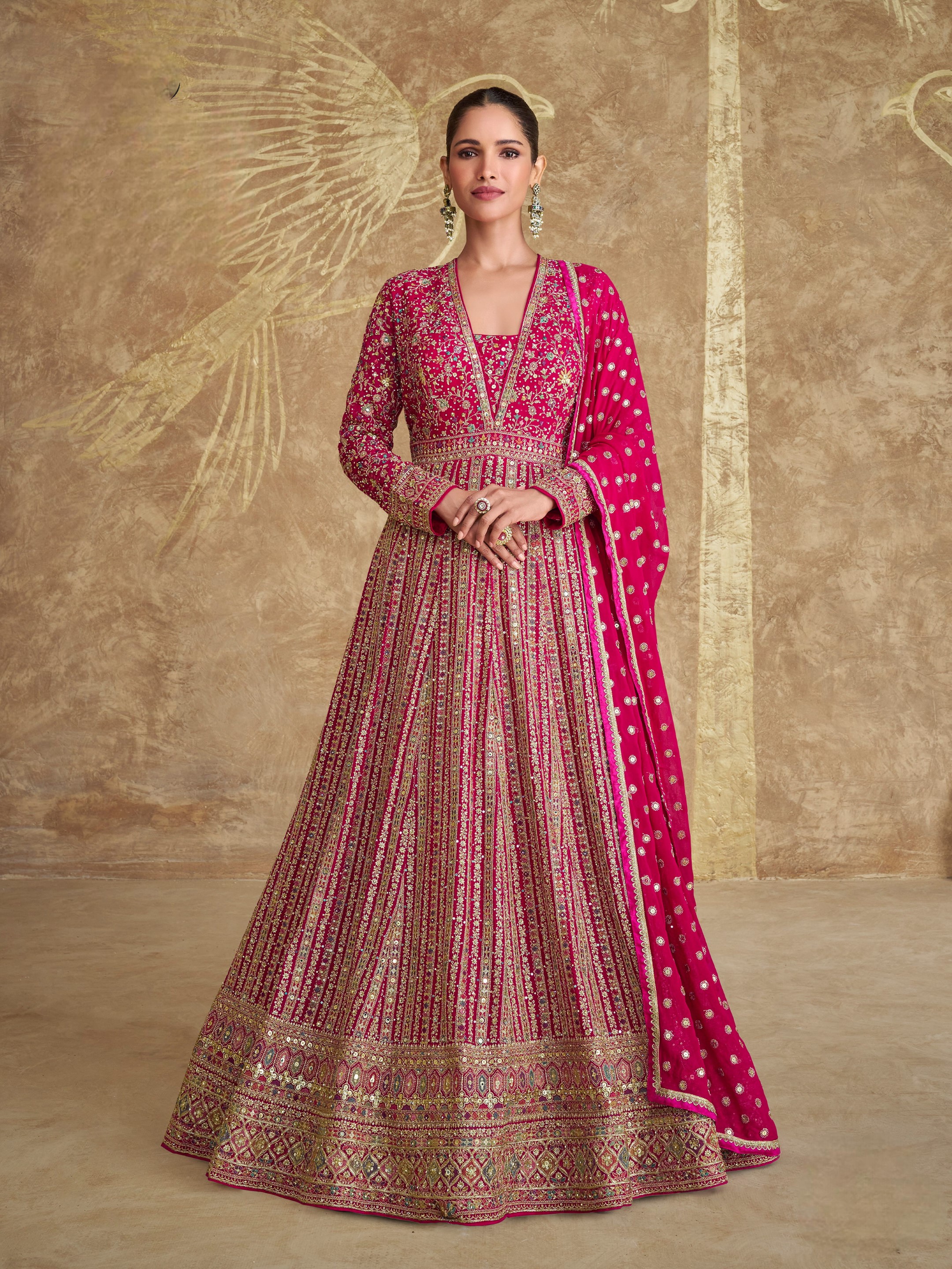 Pink Real Gerogette Sequence Embroidered Anarkali Salwar Suit (Free Size)