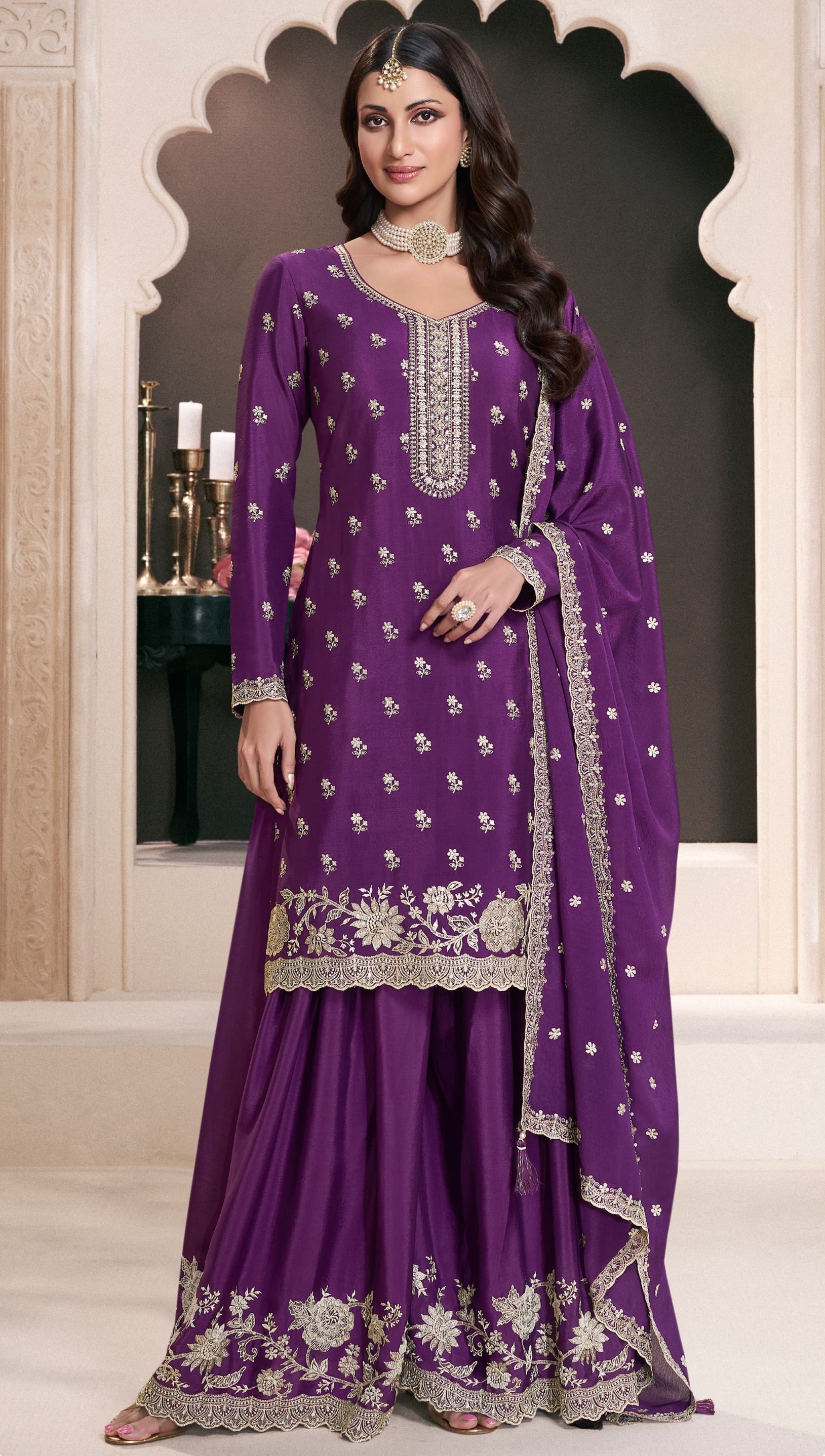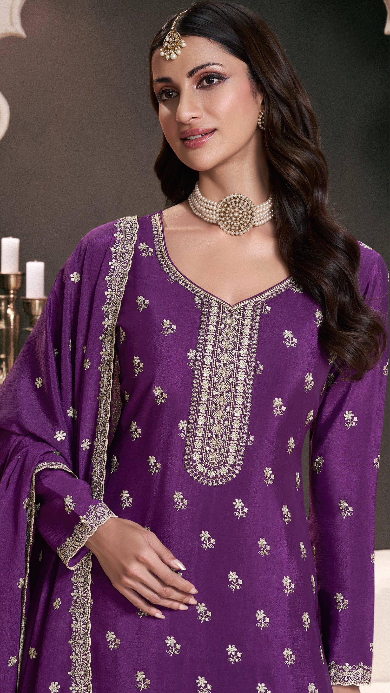 Purple Chinon Embroidered Thread Work Semi-Stitched Salwar Suit