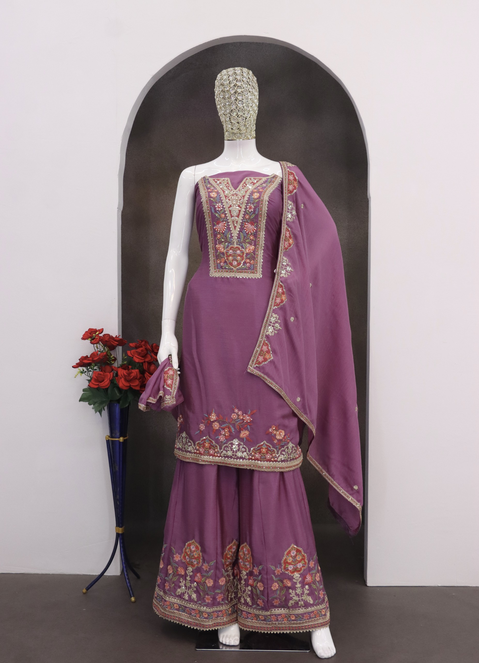 Purple Chinon Semi Stitched Suit with Embroidery Sequence Work