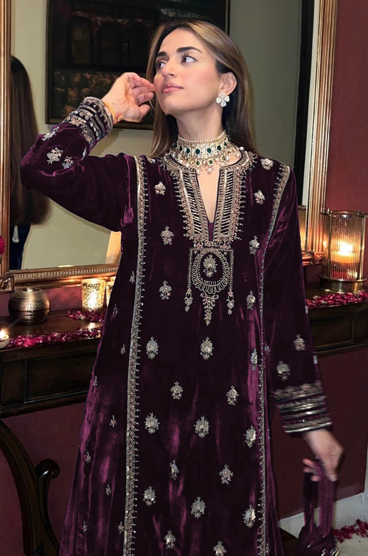 Purple Embroidered 9000 Velvet Semi Stitched Salwar Suit