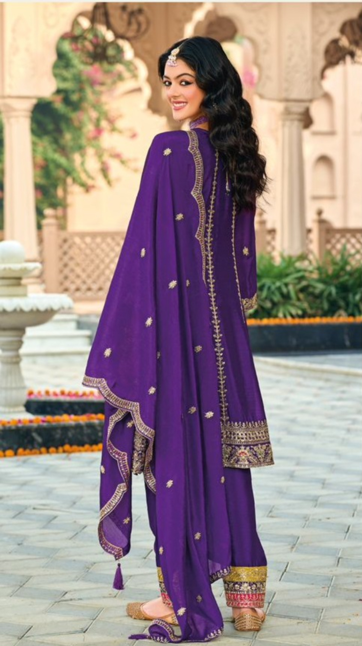 Purple embroidered Chinon Squence Work free Size stitched anarkali suit