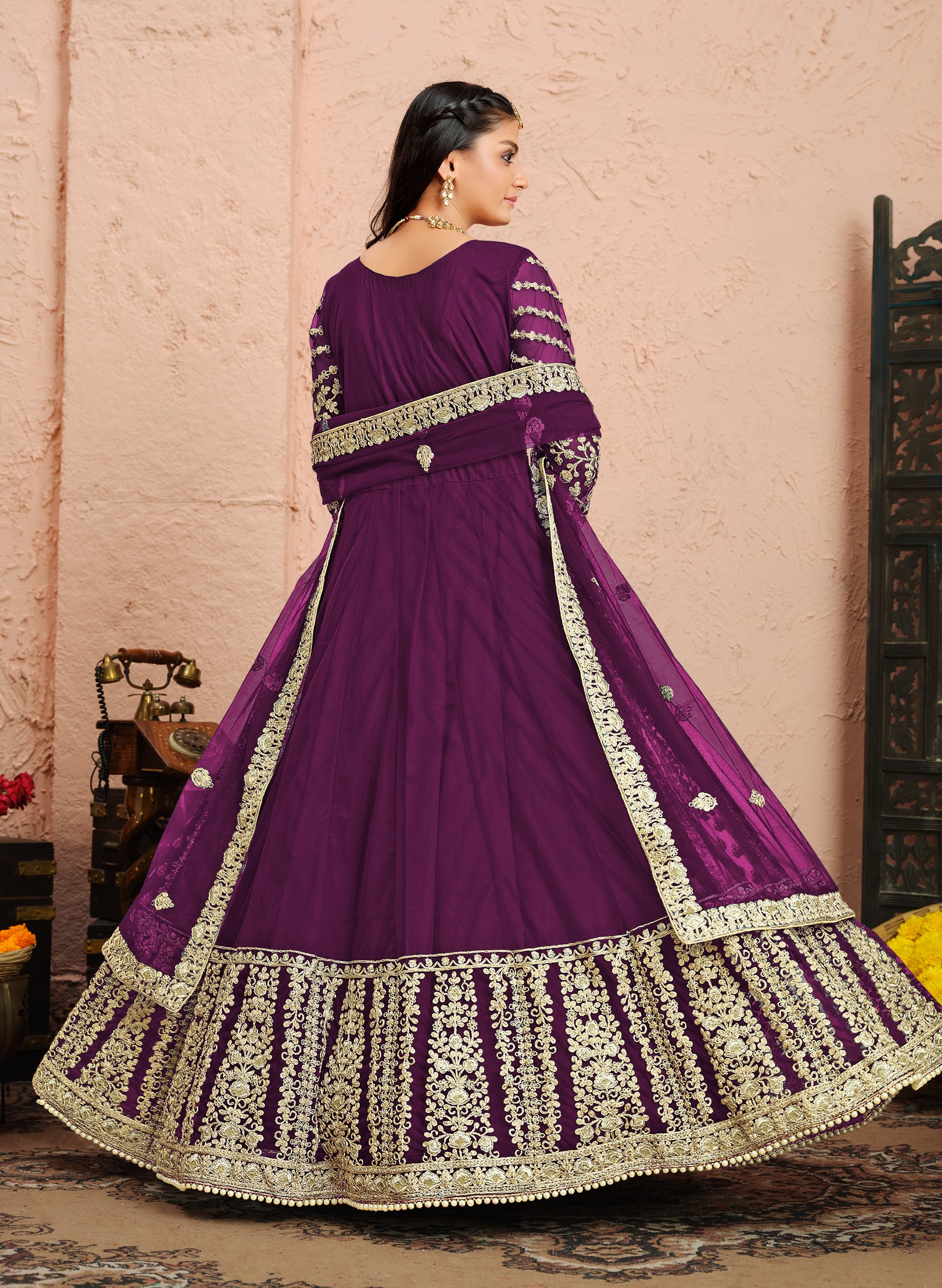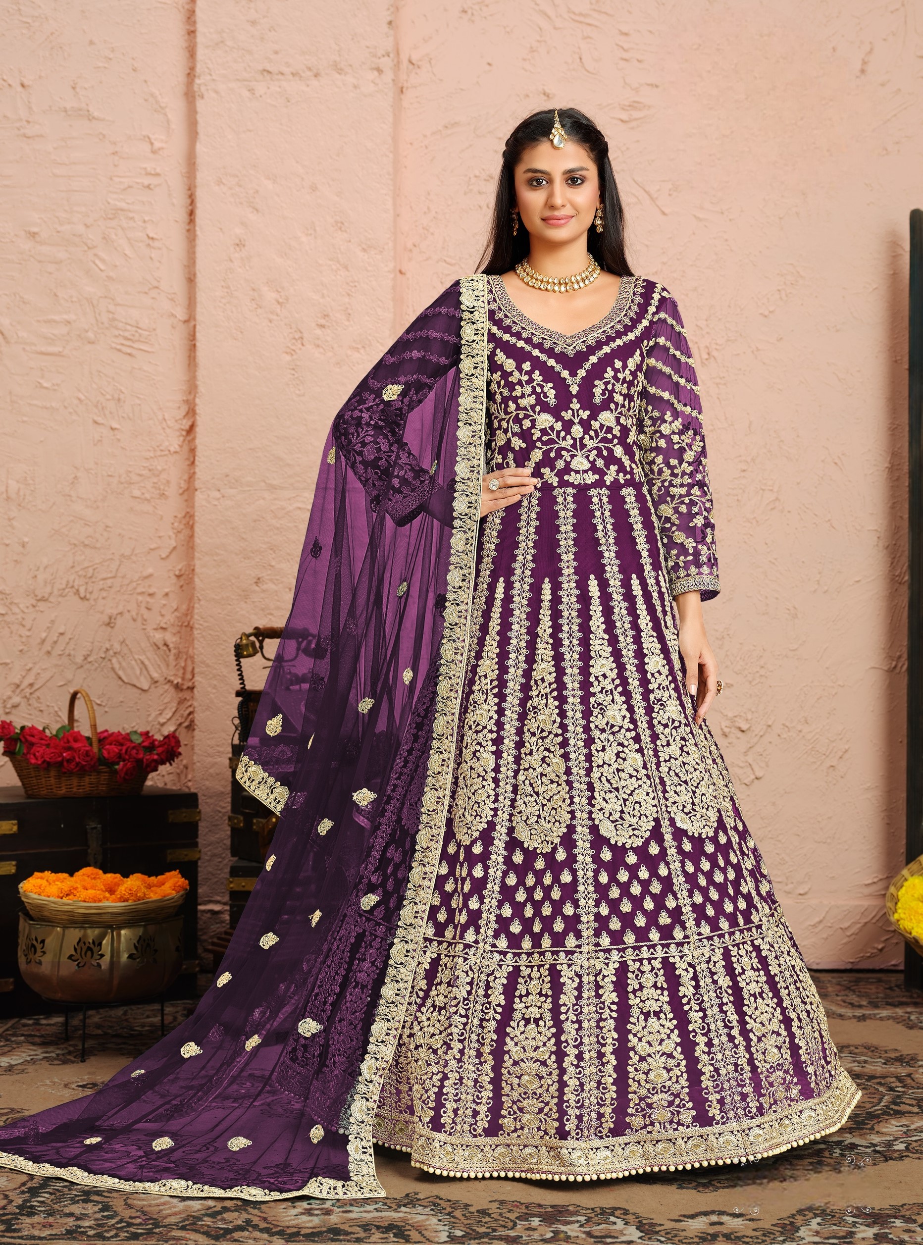 Purple Embroidered Net Semi Stitched Anarkali Suit