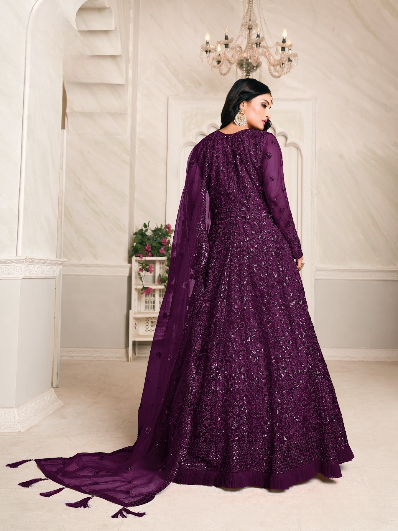 Purple Embroidered Net Semi Stitched Anarkali Suit