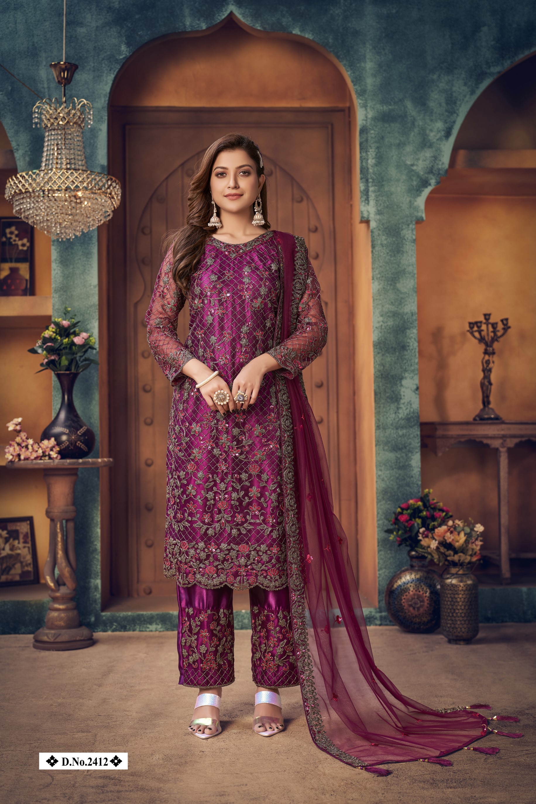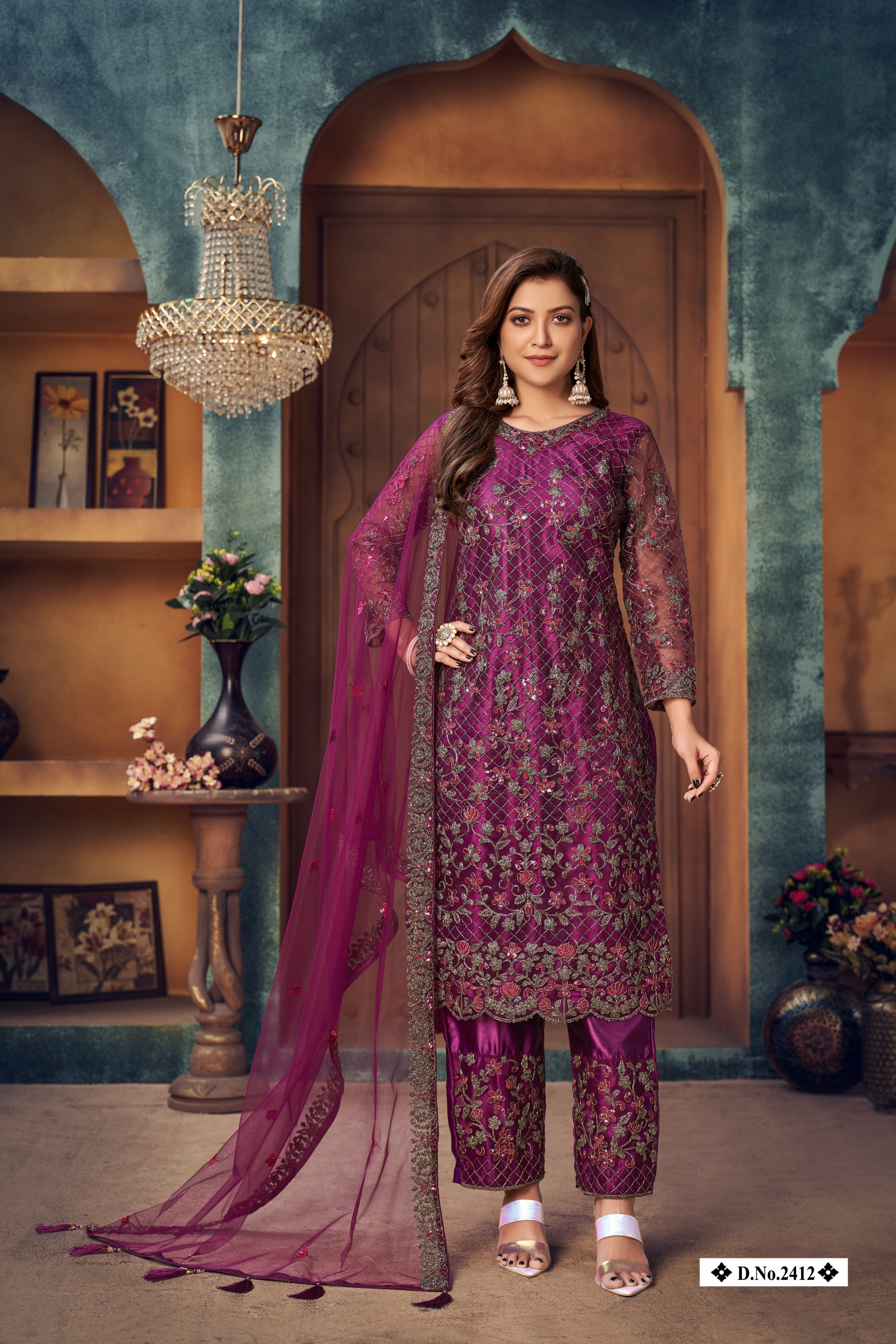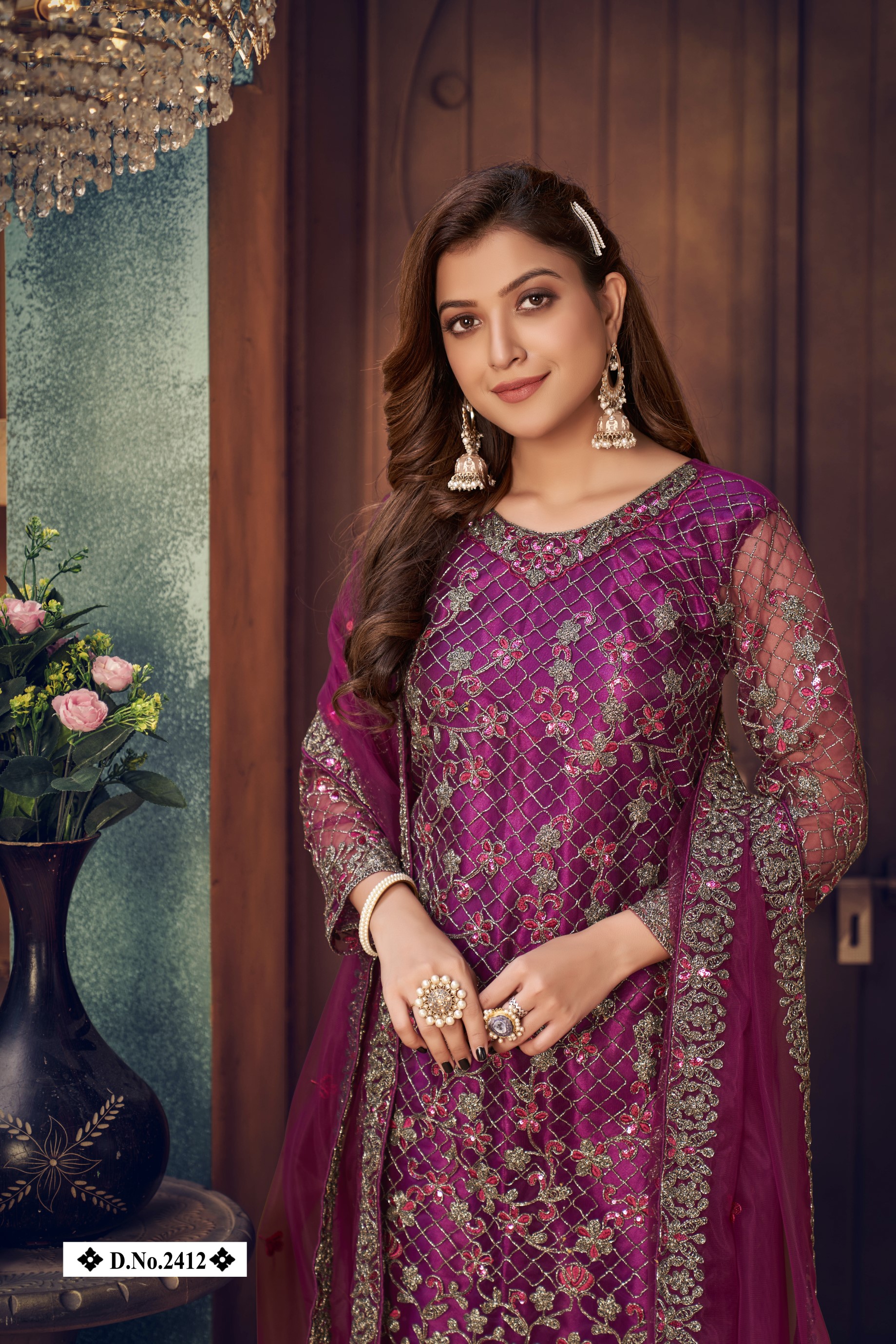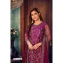 Purple Embroidered Net Semi Stitched Salwar Suit